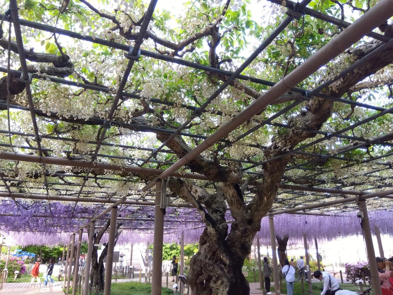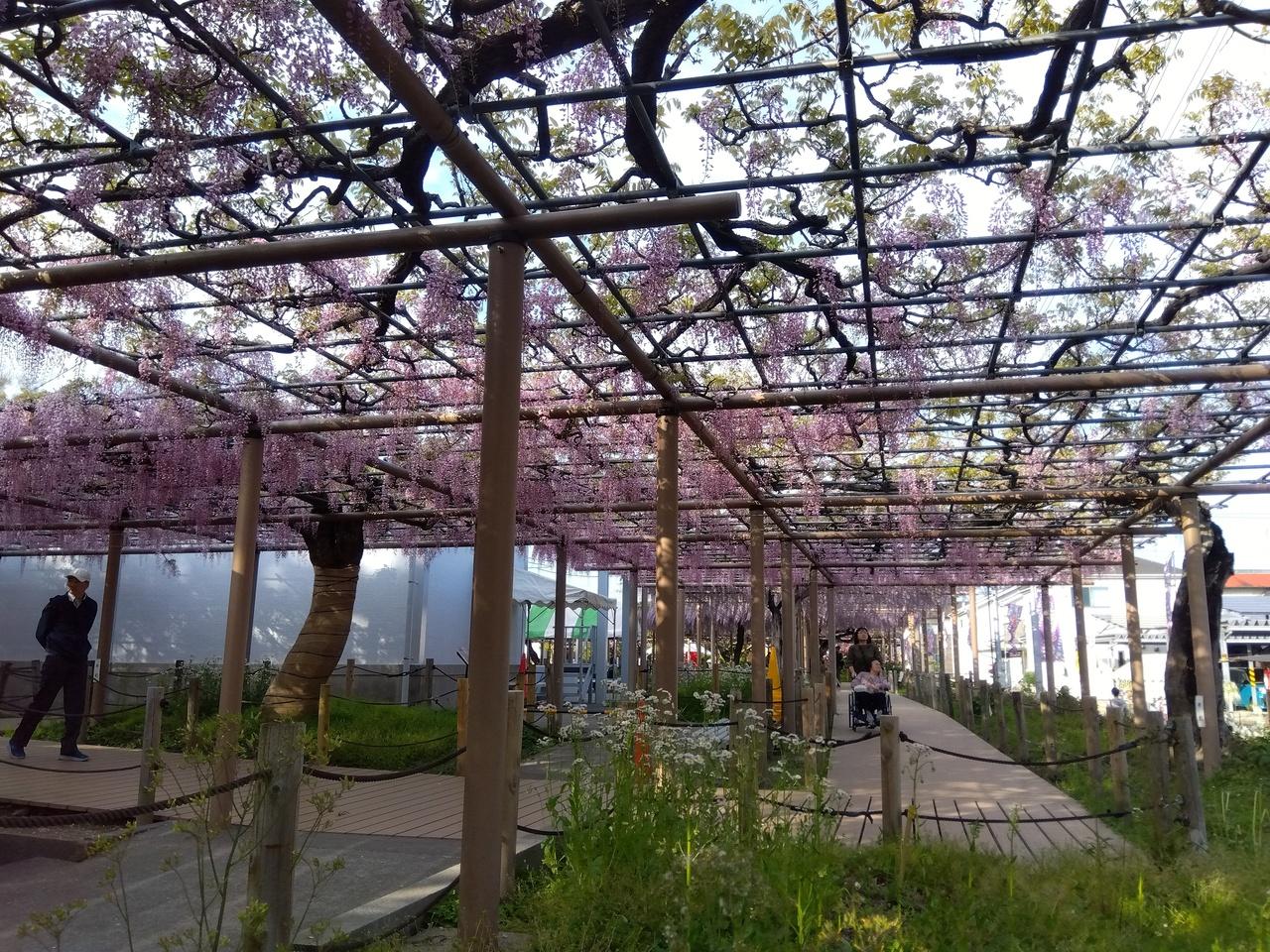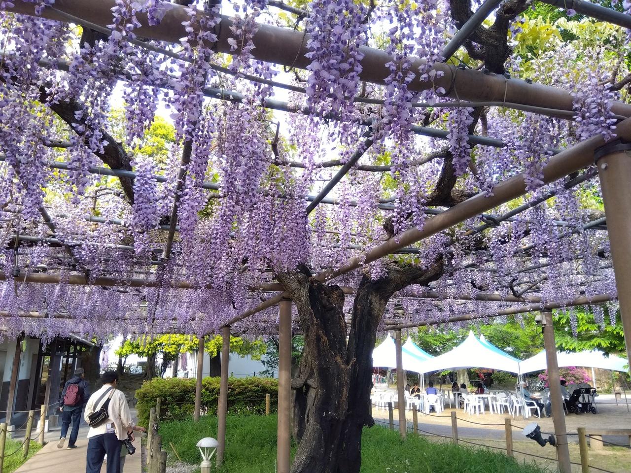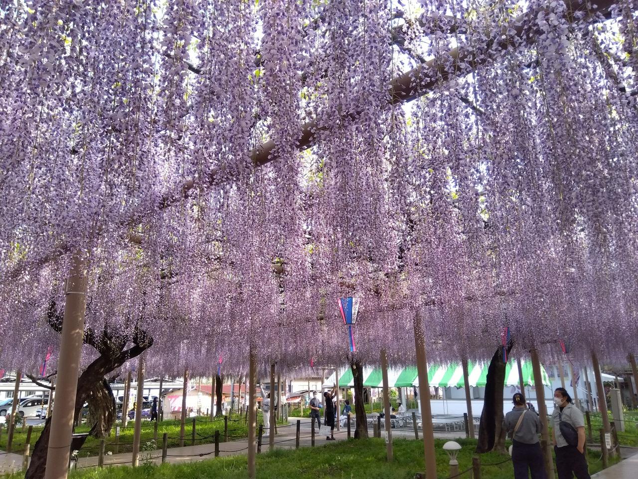 曼荼羅寺公園の藤まつりで藤の花が満開になってきました。藤棚の面積はかなり広いです。今日は平日であまり開いていなかったが屋台がたくさん出ています。