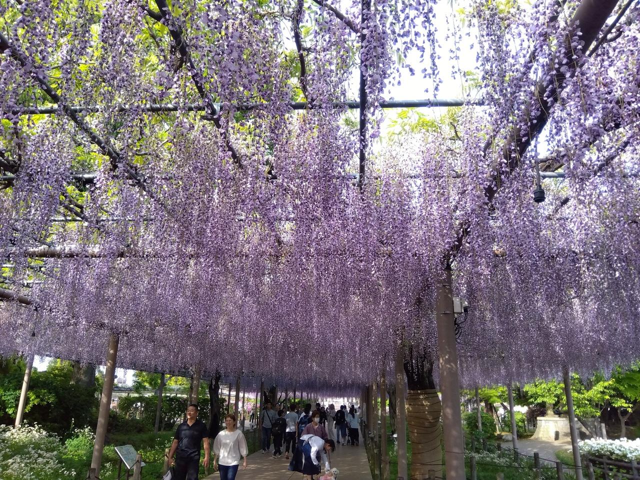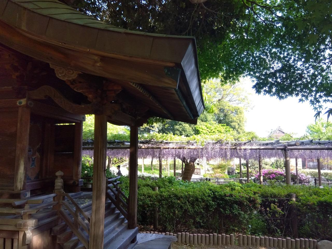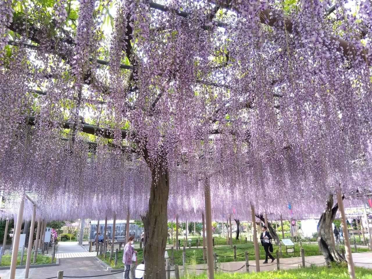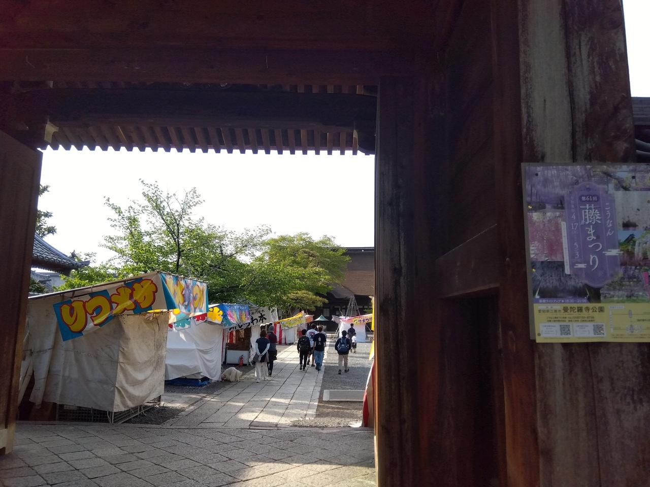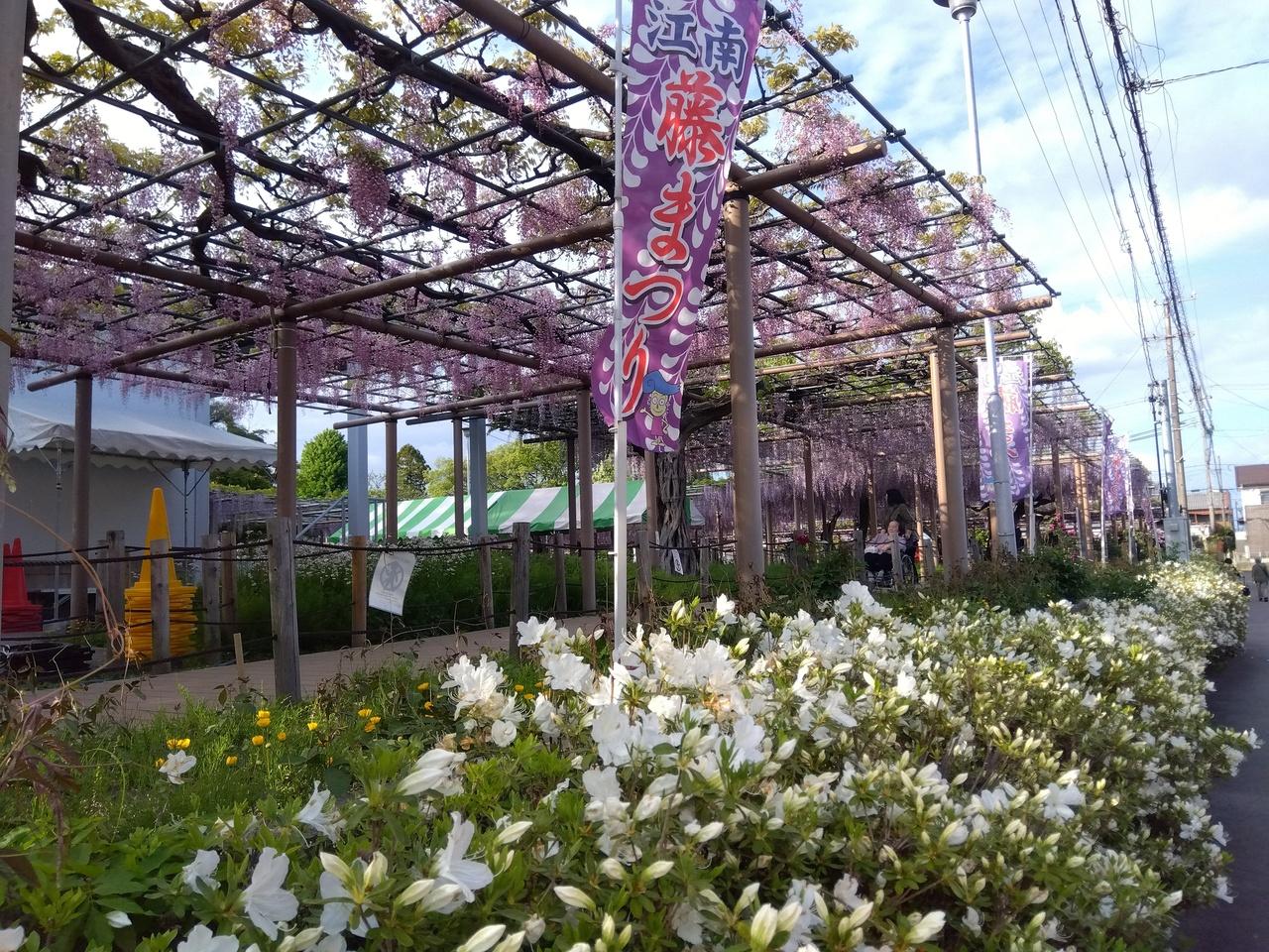 曼荼羅寺公園の藤まつりで藤の花が満開になってきました。藤棚の面積はかなり広いです。今日は平日であまり開いていなかったが屋台がたくさん出ています。