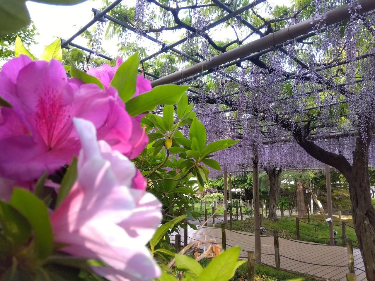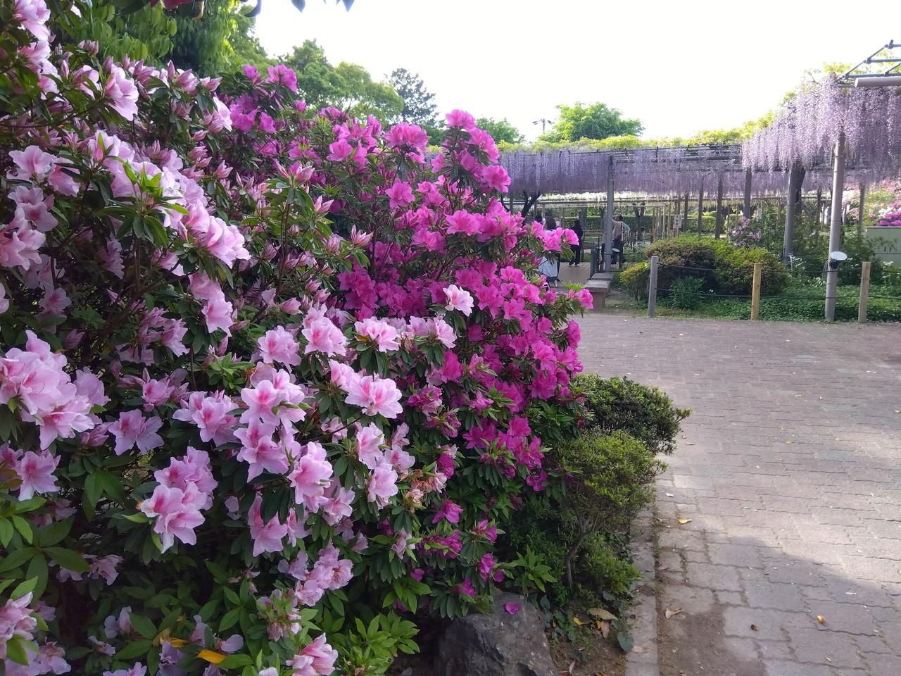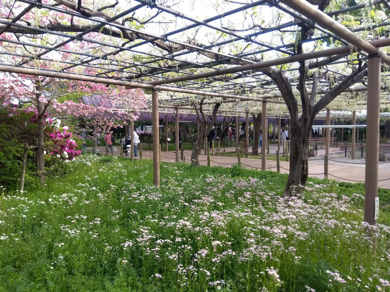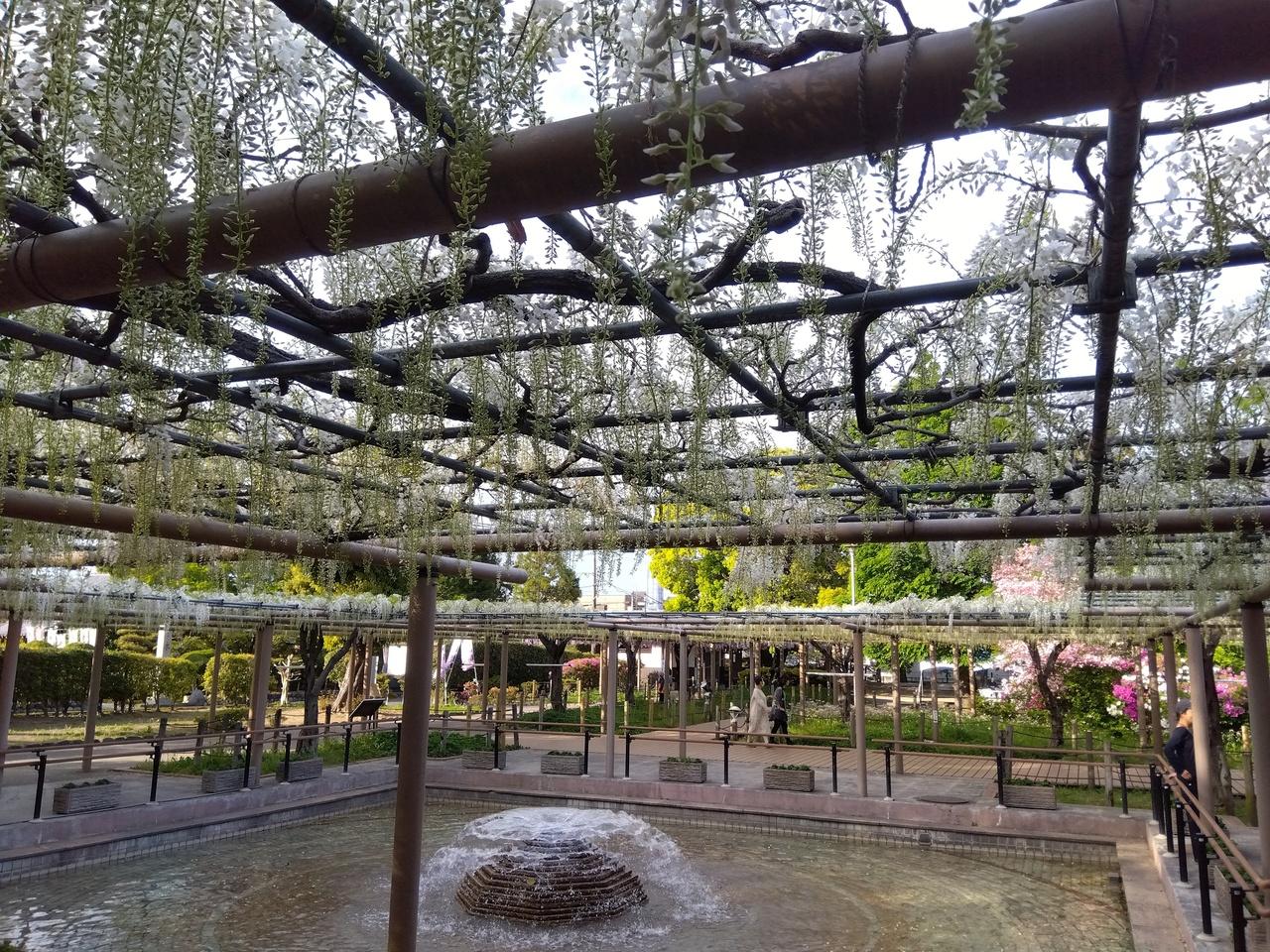 曼荼羅寺公園の藤まつりで藤の花が満開になってきました。藤棚の面積はかなり広いです。今日は平日であまり開いていなかったが屋台がたくさん出ています。