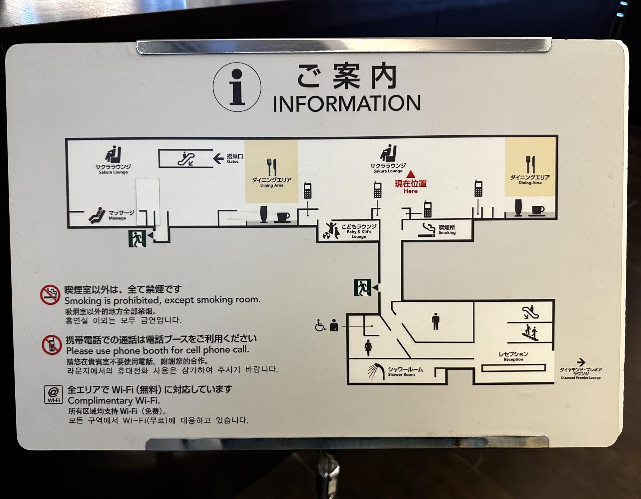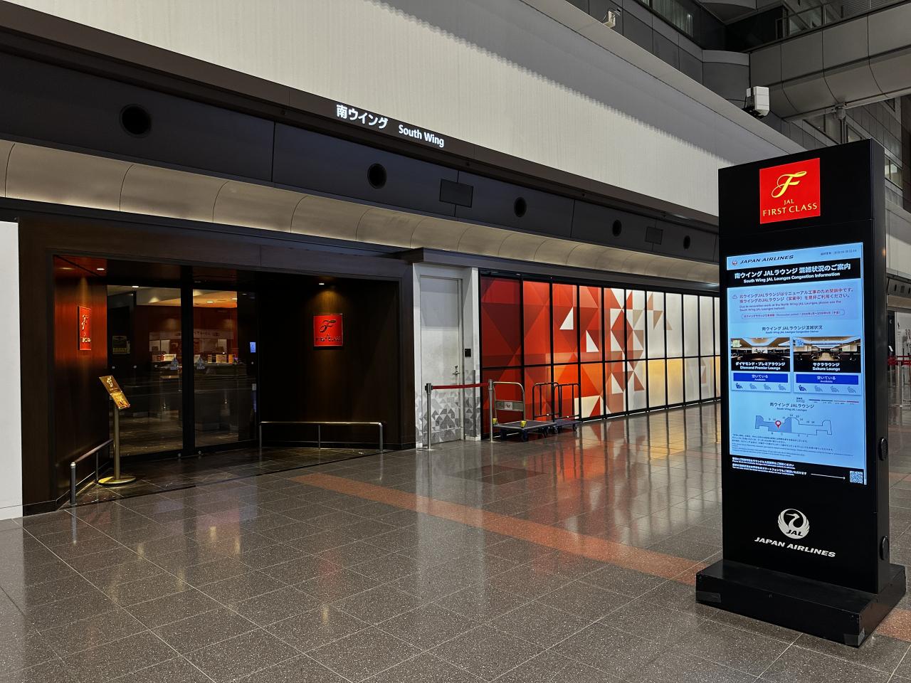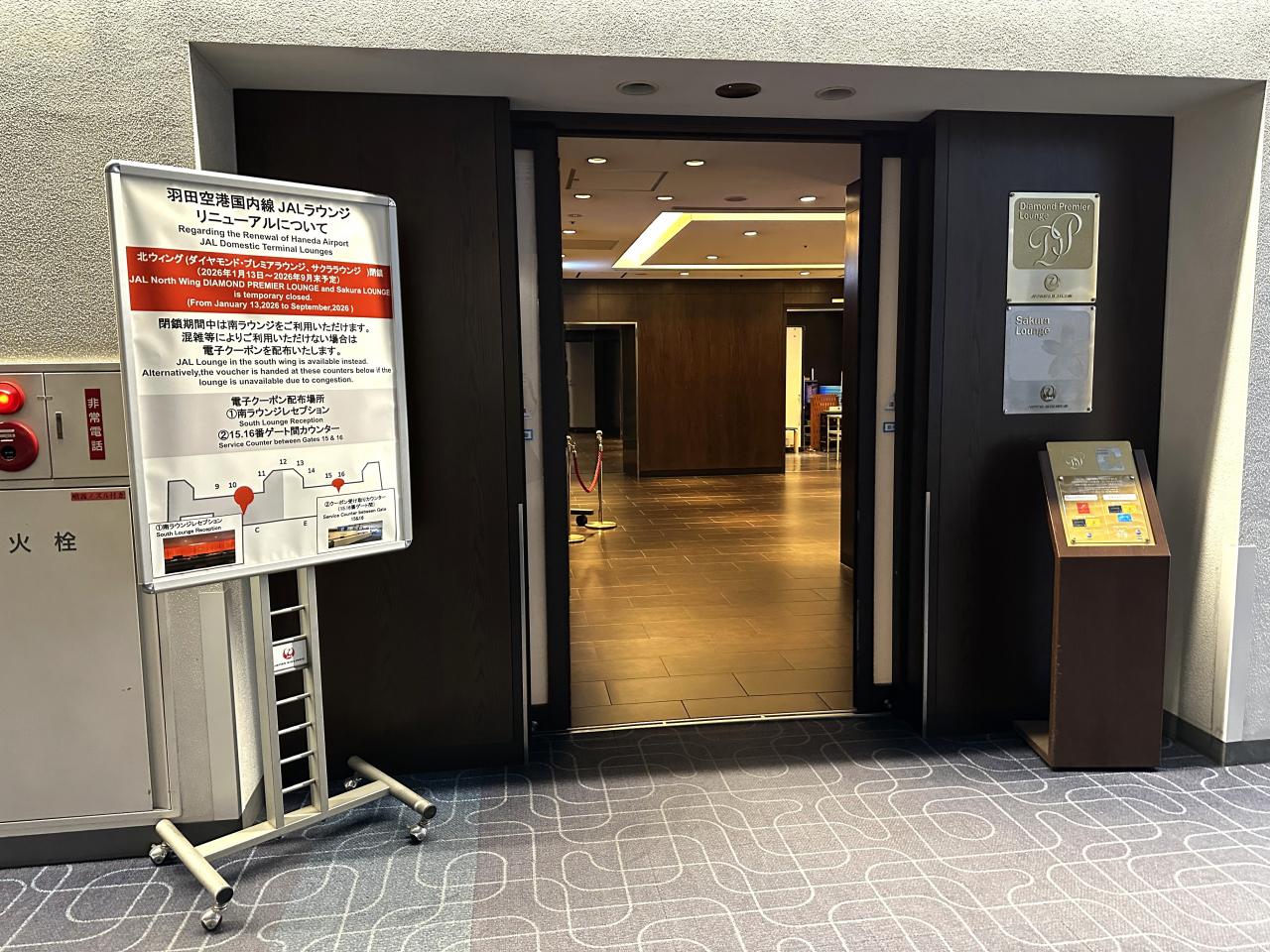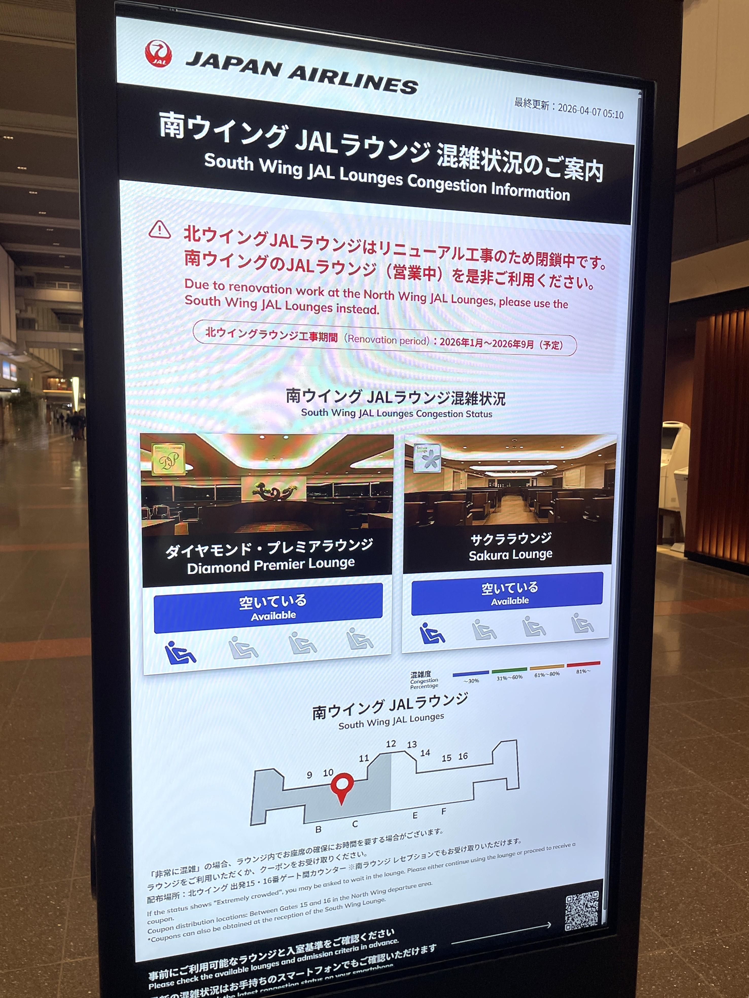 JAL『サクララウンジ』がリニューアル工事中のため閉鎖しています。