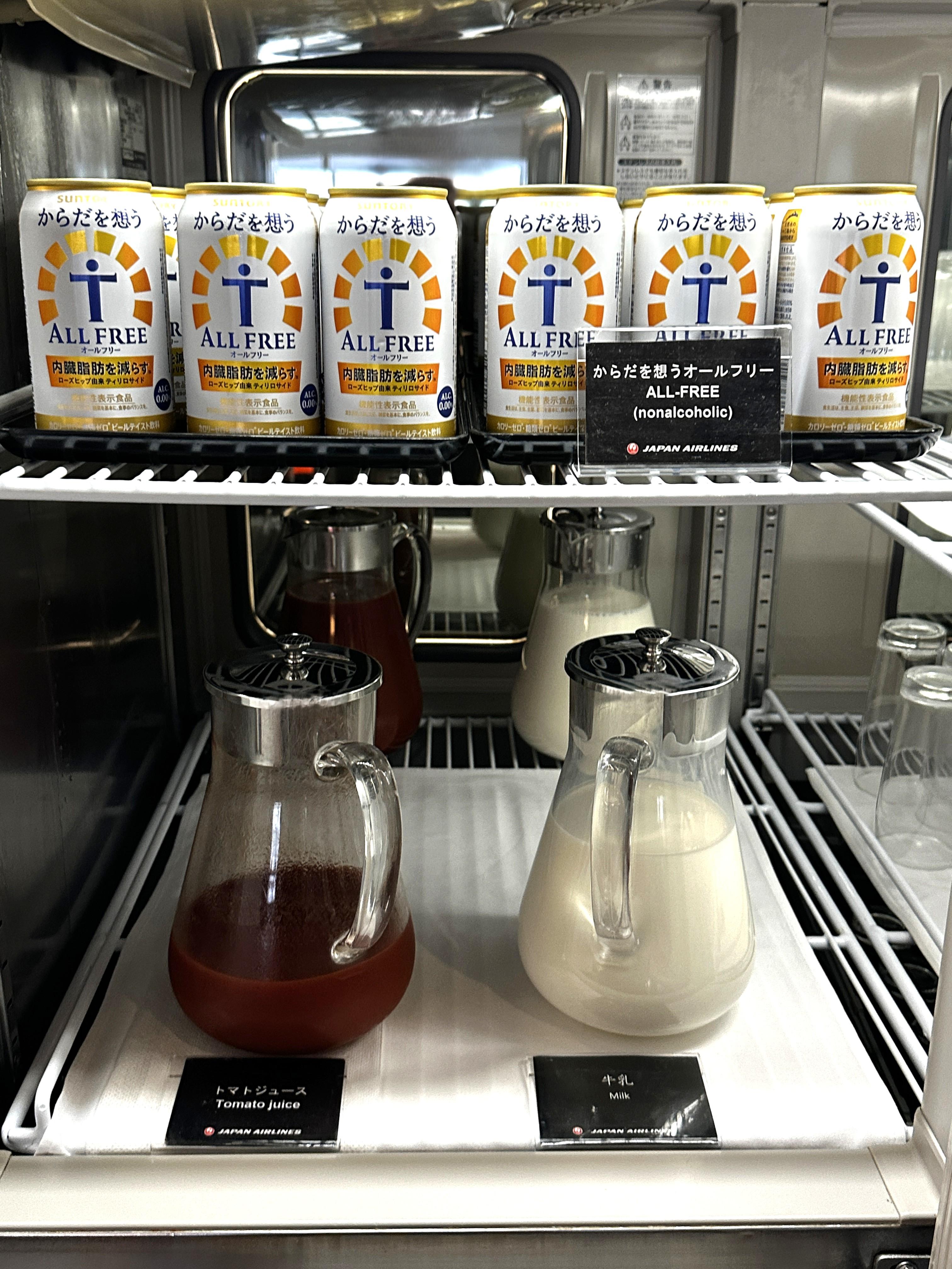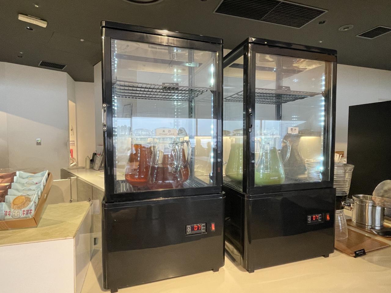 冷蔵庫の中にある黒酢ジュースと、青汁(豆乳入り)をいただきます。POWER LOUNGE SOUTH (第1旅客ターミナル2F 南ウィング) 空港ラウンジ