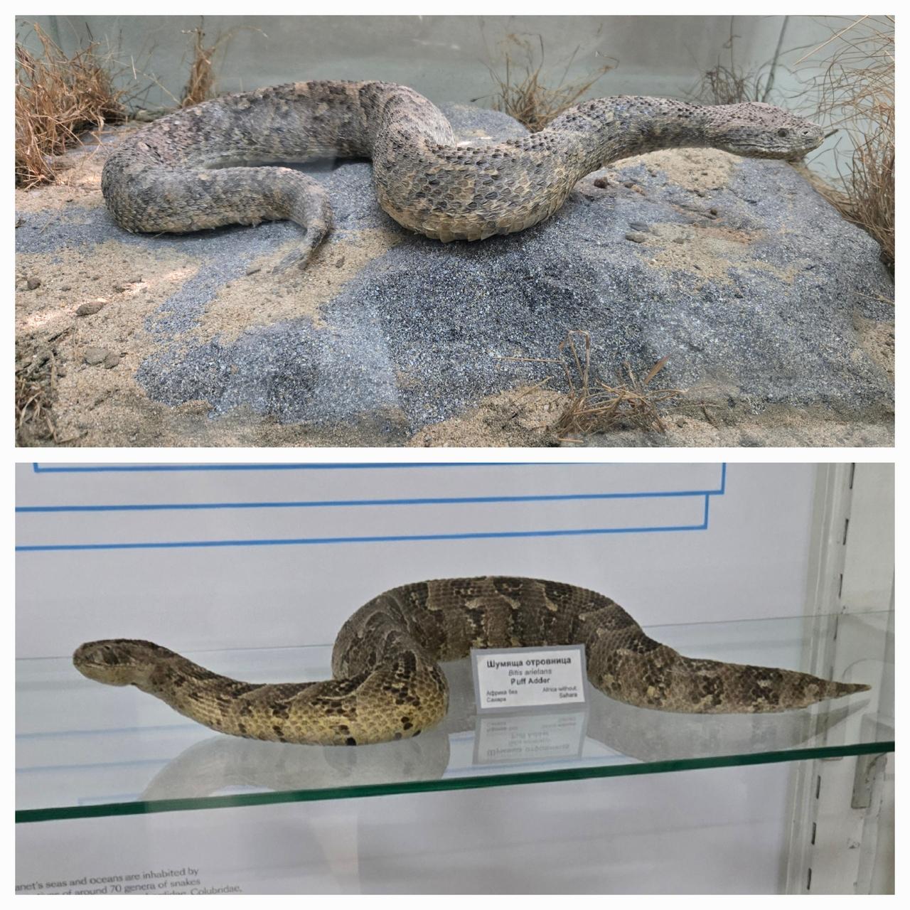 トイレのために入った割には楽しめました。鳥から始まって、ヘビほかの爬虫類、大型の動物、昆虫と意外と充実していました。写真は、胴が短いヘビ。ツチノコみたい。
