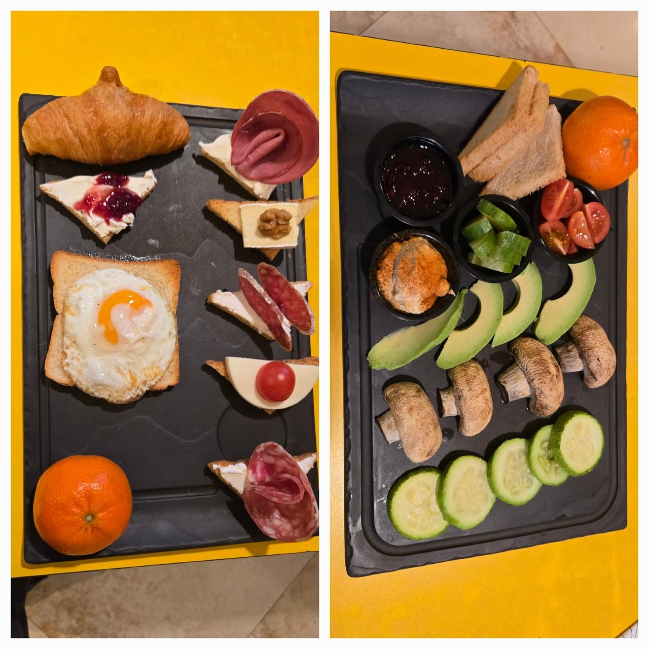 翌日の朝食です。ヨーロッパではほとんどのホテルがビュッフェスタイルですが、ここは注文式でした。2種類の朝食から選ぶ形でした。それぞれ1つずつオーダーしてシェアしましたが、両方とも美味しかったです。私たちが泊まったような中級ホテルのビュッフェだと、ハッキリ言って大した物は置いていません。このメニューならビュッフェよりずっと良いと思います。