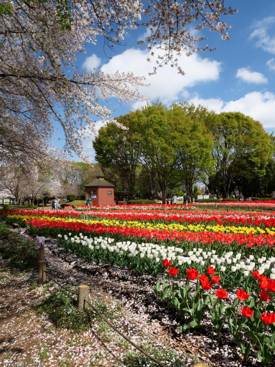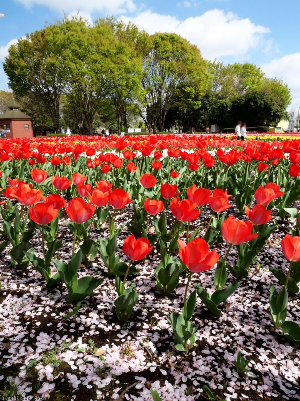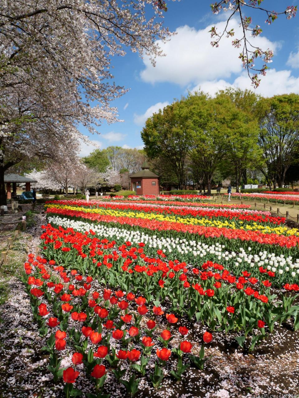 訪れたのは、それから約1週間後、チューリップは満開継続中、サクラは散り進んでいました。それでもサクラの花は未だ残っていて、散った花びら、散る花吹雪も含めて、綺麗に見られました。