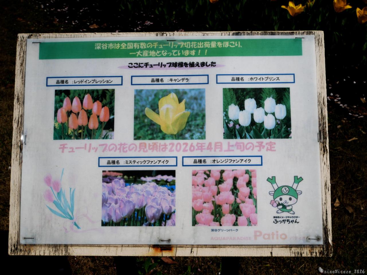 公式ホームページによれば、昨年(2025)の11月15日に植え付けたチューリップは、今年(2026)の1月末に発芽が始まり、3月15日に咲き始めました。