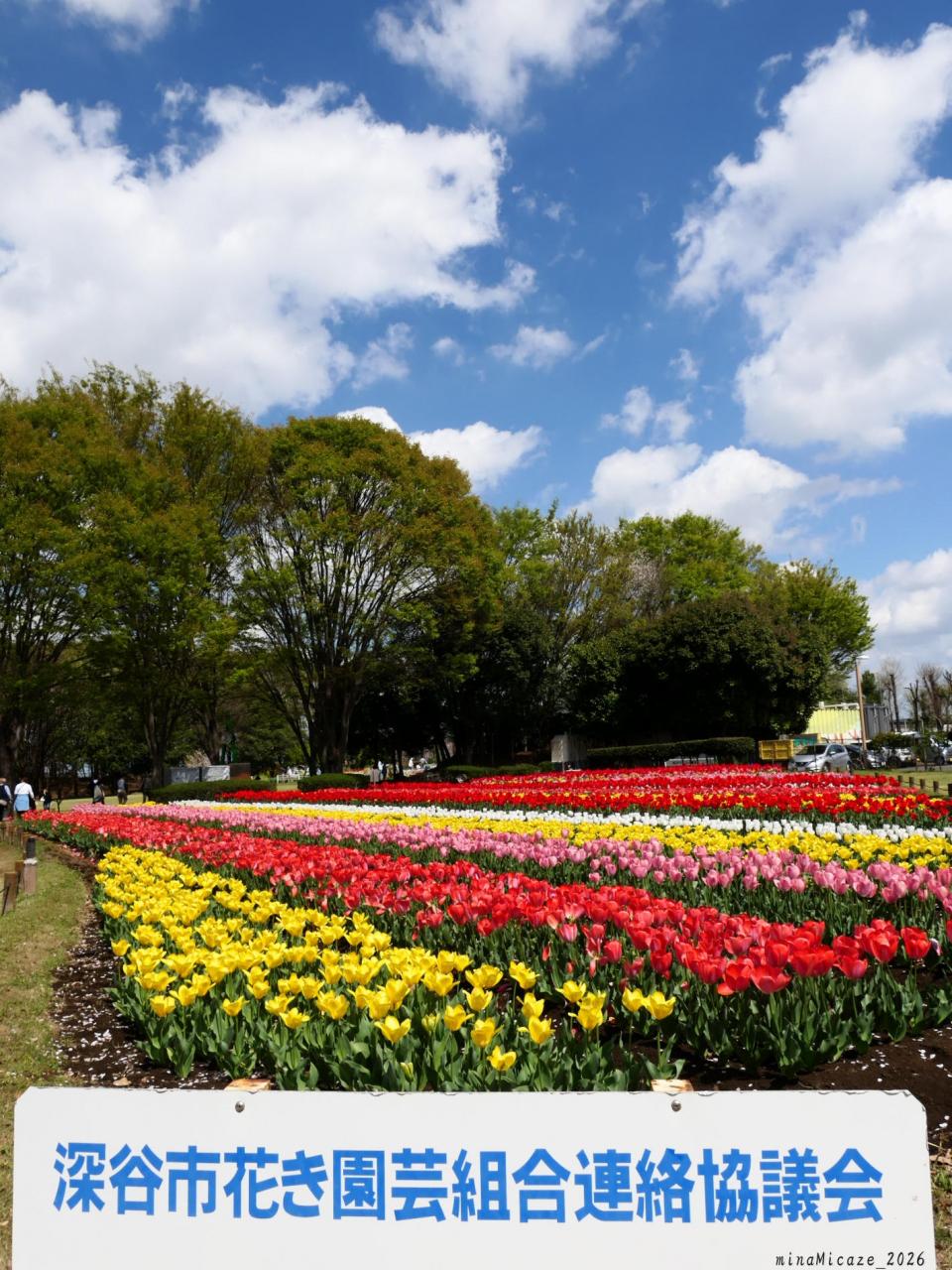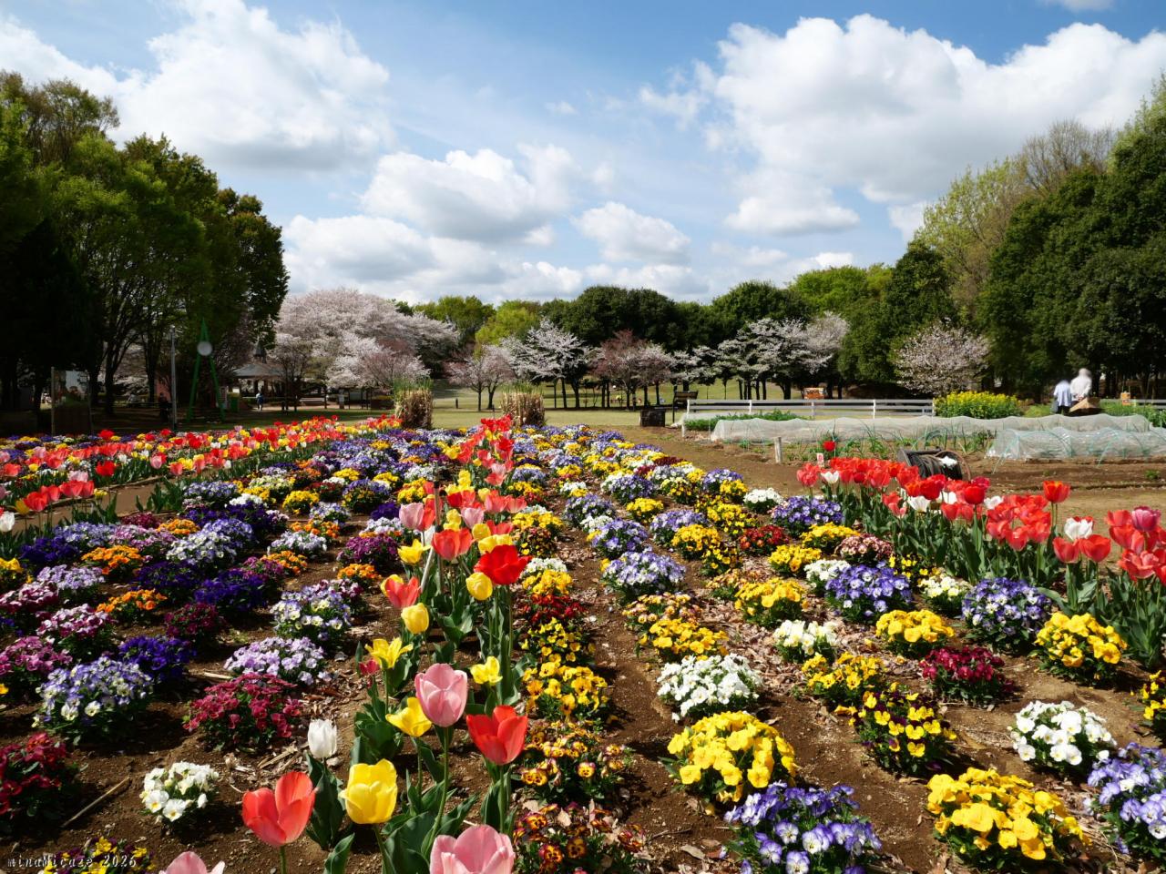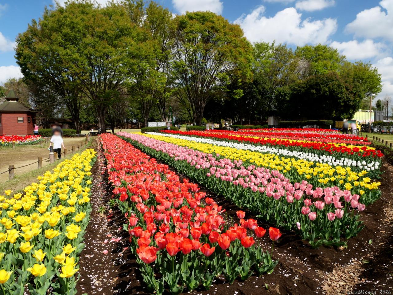 埼玉県深谷市の「深谷グリーンパーク」です。敷地の中央の花壇では、春はチューリップ、夏はユリ、秋にはコスモスを咲かせています。