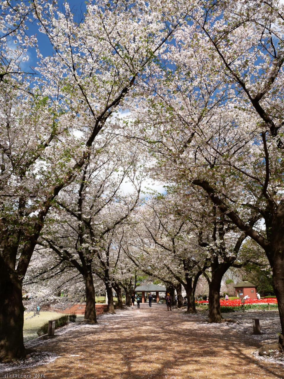 花壇の隣のサクラ並木は、3月25日頃に咲き初め、3月29日に満開になりました。(公式ホームページ)