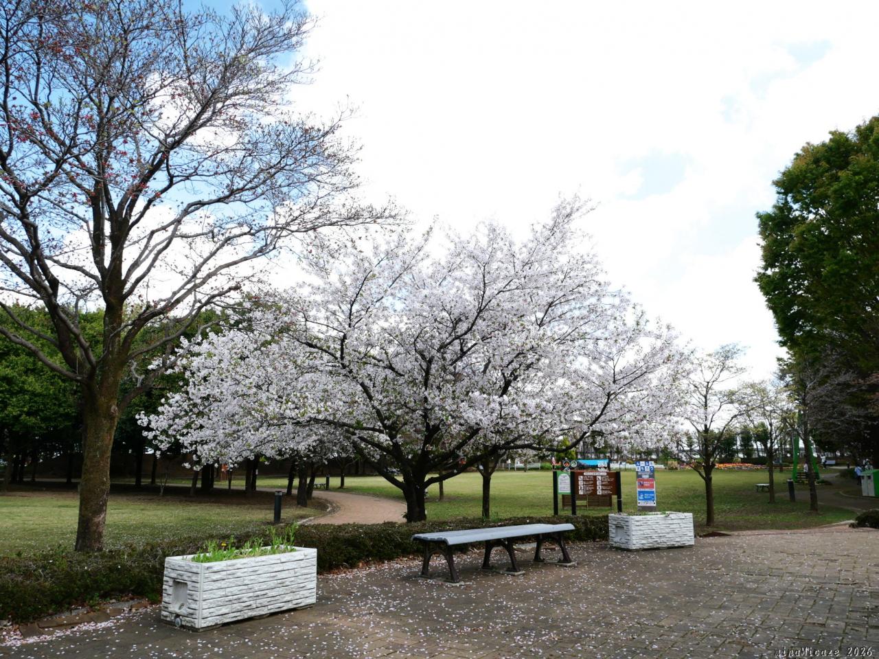その隣は多目的広場、この広場の周囲にも立派なサクラが植栽されています。