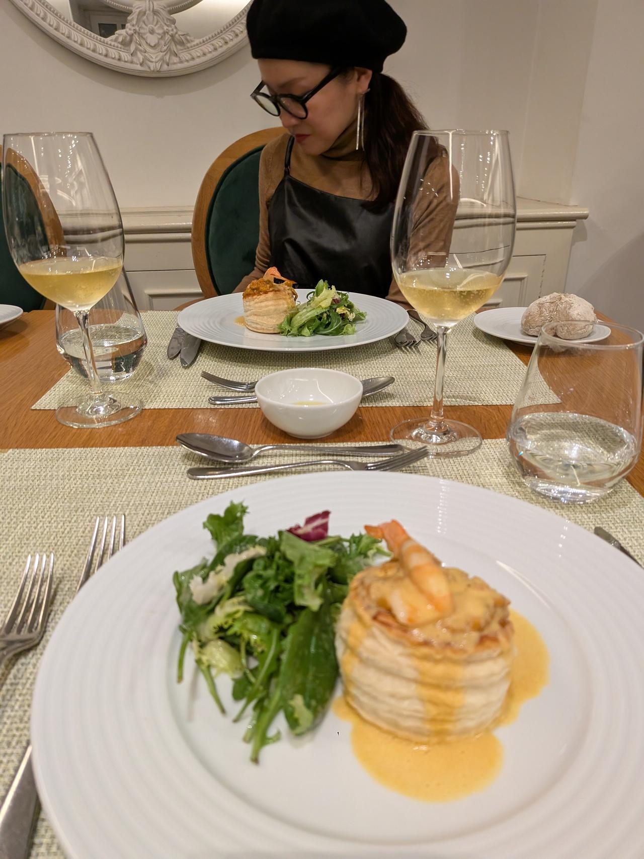 ポルトガル風のフレンチコースのスタートはシーフードのクリームスープ。これが絶品だった。スープなんだけどパイに包まれてて美味しかった