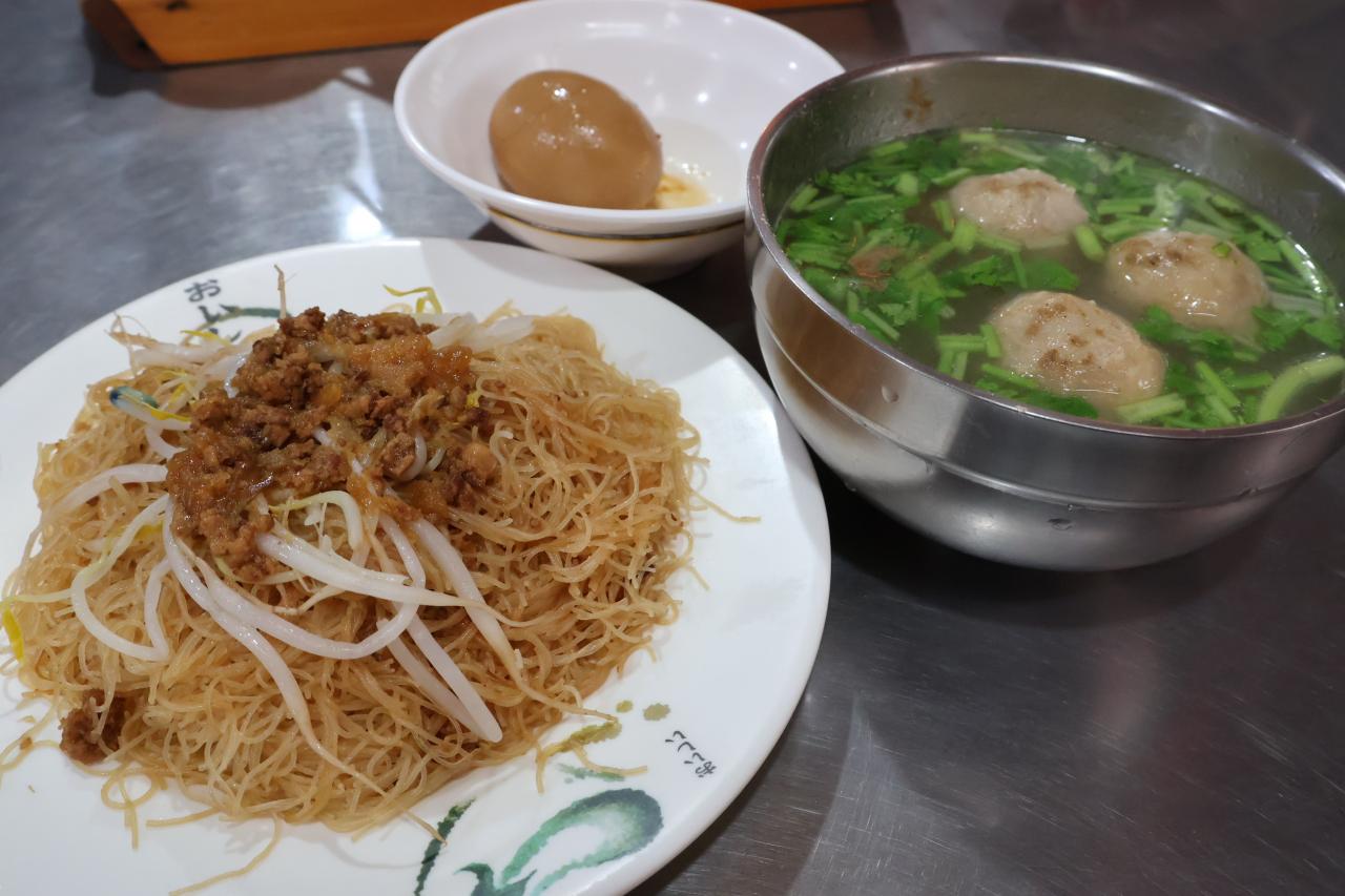 炒米粉(小)45元、貢丸湯40元、魯蛋15元、全部で100元(約530円)