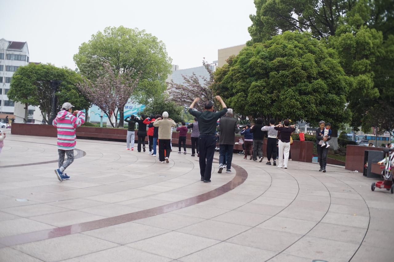 写真は、七宝駅付近での、地元の人々の体操? -