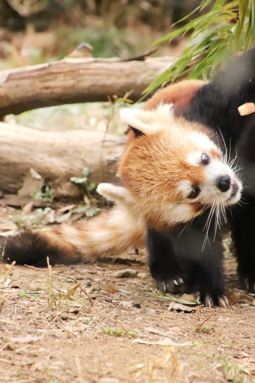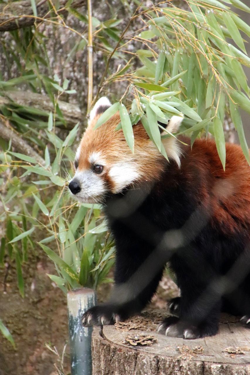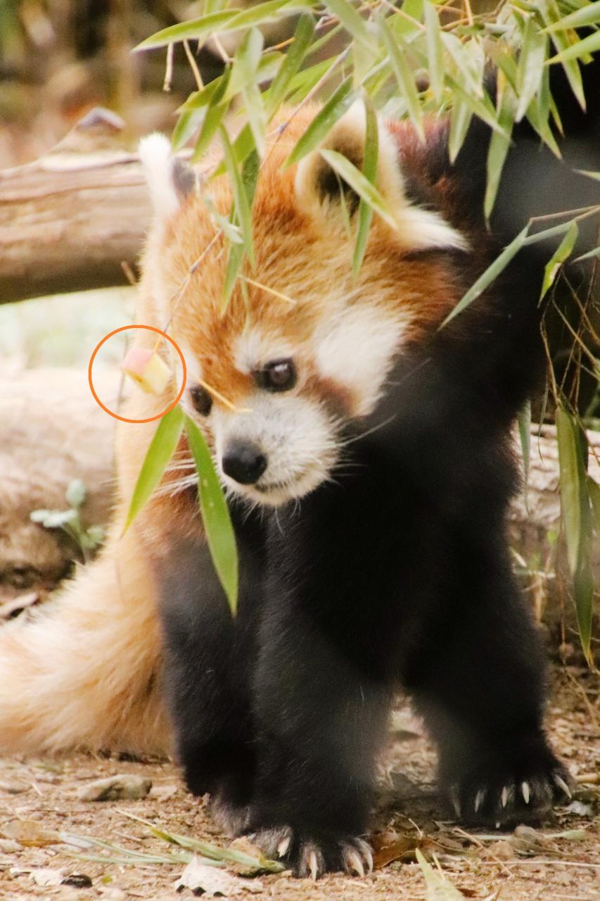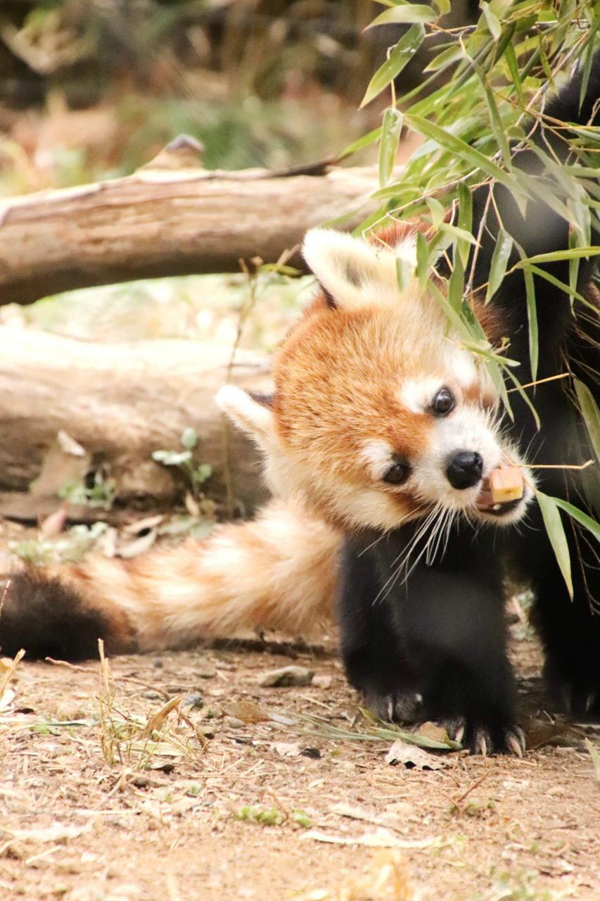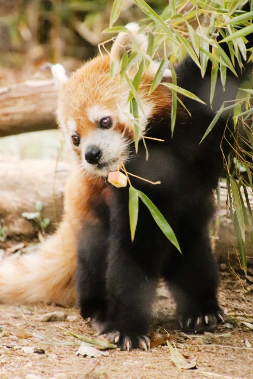なので今回は、レッサーパンダの写真の収穫はあんまりないかも、と思いながら、近くで持参のパンを食べながら休憩していたら……ココロくんが降りてきて、笹を食べたり、遅ればせながらリンゴを見つけたり、めちゃくちゃフォトジェニックでした!