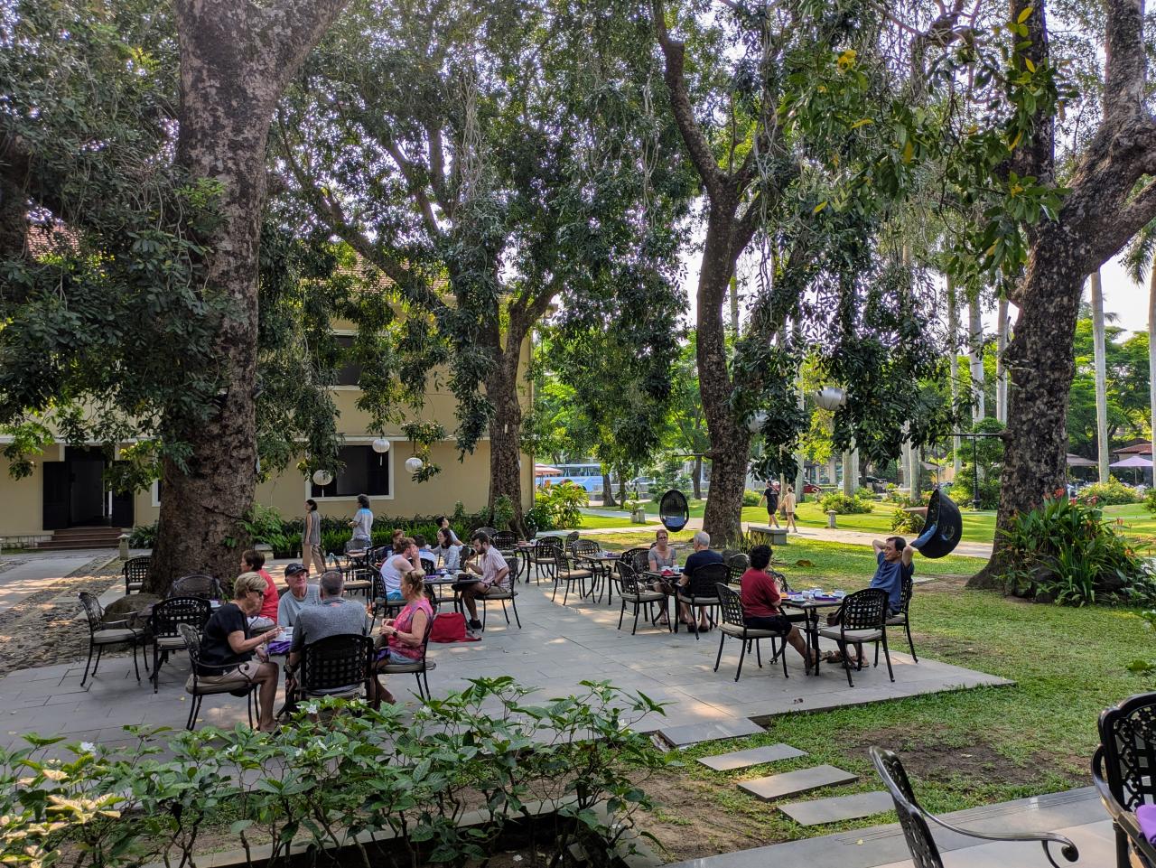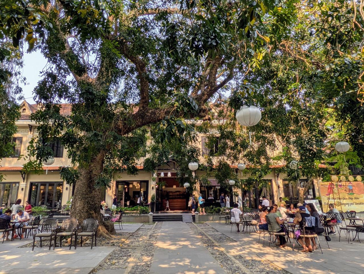 正面の建物が朝食会場です。外にも席があります。この木、すごく大きい…!