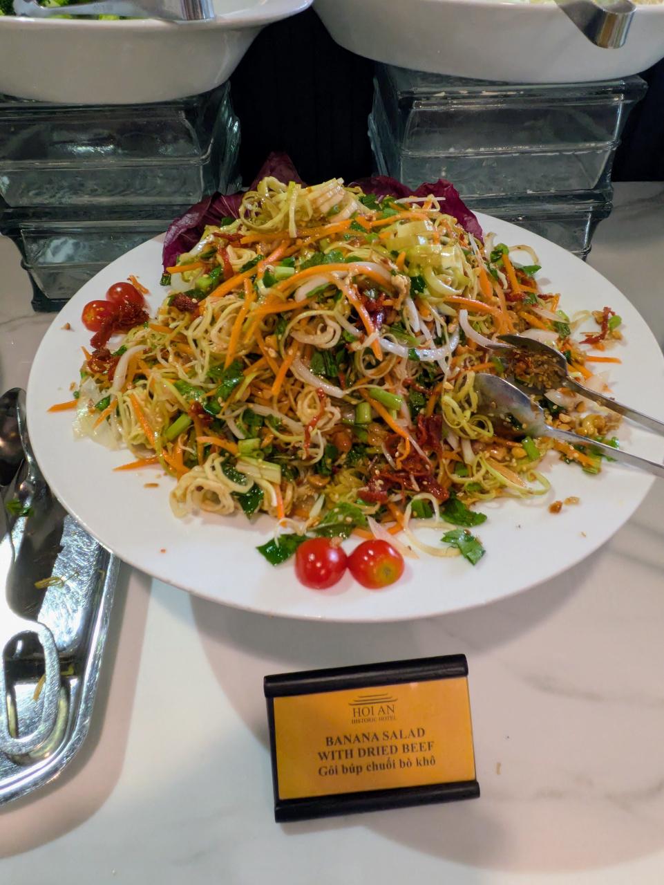 バナナサラダというのがありました。初めて!薄黄色い麺のように見えるのが、細切りにしたバナナの花(つぼみ)だそうです。シャキシャキした歯ごたえ。検索したら、バナナの花や茹でた鶏肉、ピーナッツ、ハーブなどを魚醤(ヌクマム)ソースであえたサラダと出てきました。さっぱりした味つけでおいしかったです。