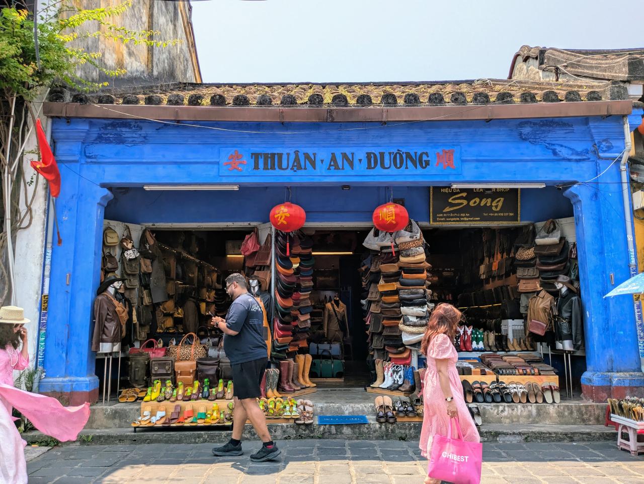 青い壁が目を引くお店。皮製品の店のようです。
