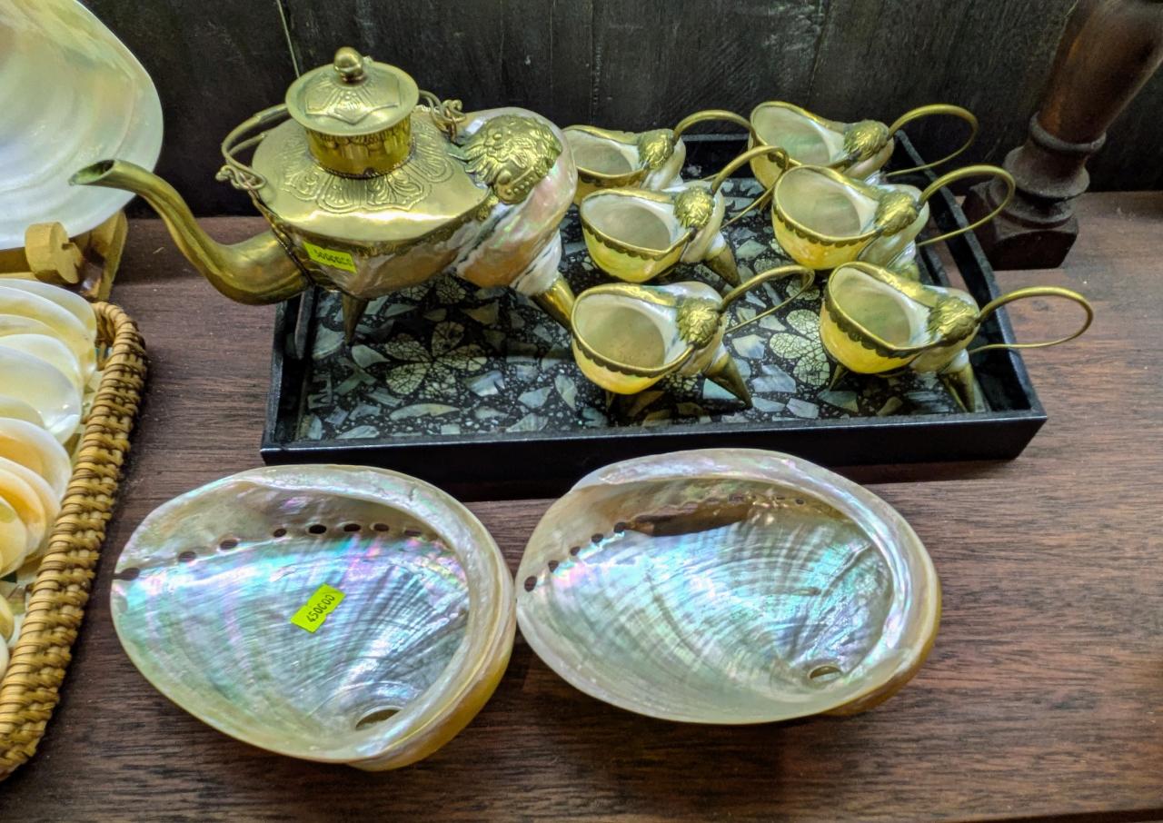 これはショップで売られていた茶器のセット。カップがすべて同じ色と形の貝…!