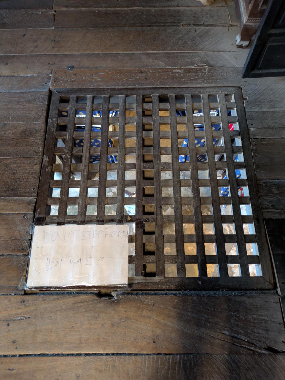2階床にはめられた格子戸。「乗らないでください」の注意書きが。