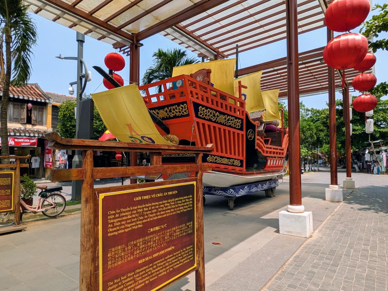 通りの西のはずれまで来たら、朱印船の巨大なレプリカがありました。下に車輪がついているので山車みたいに動きそう。