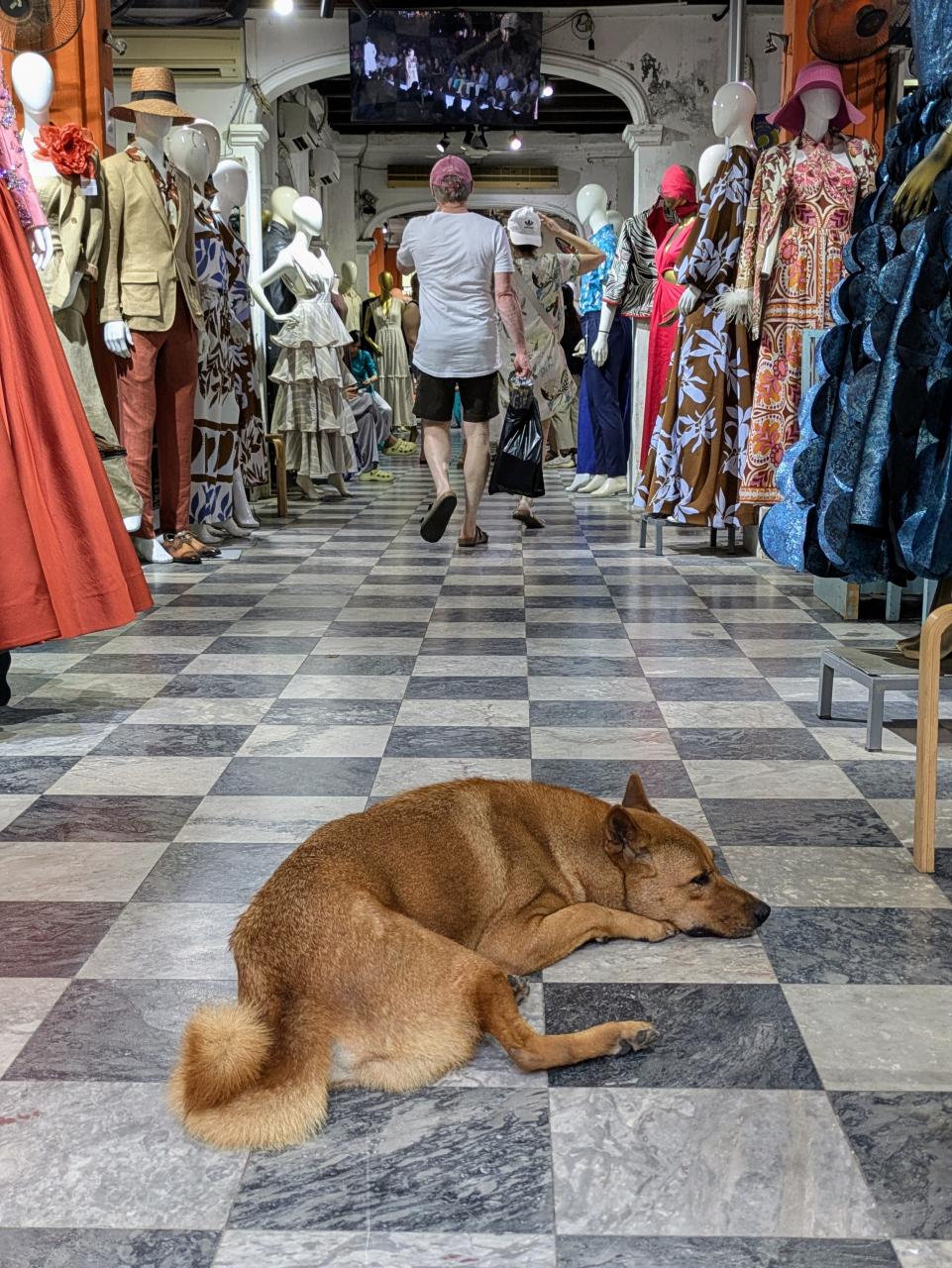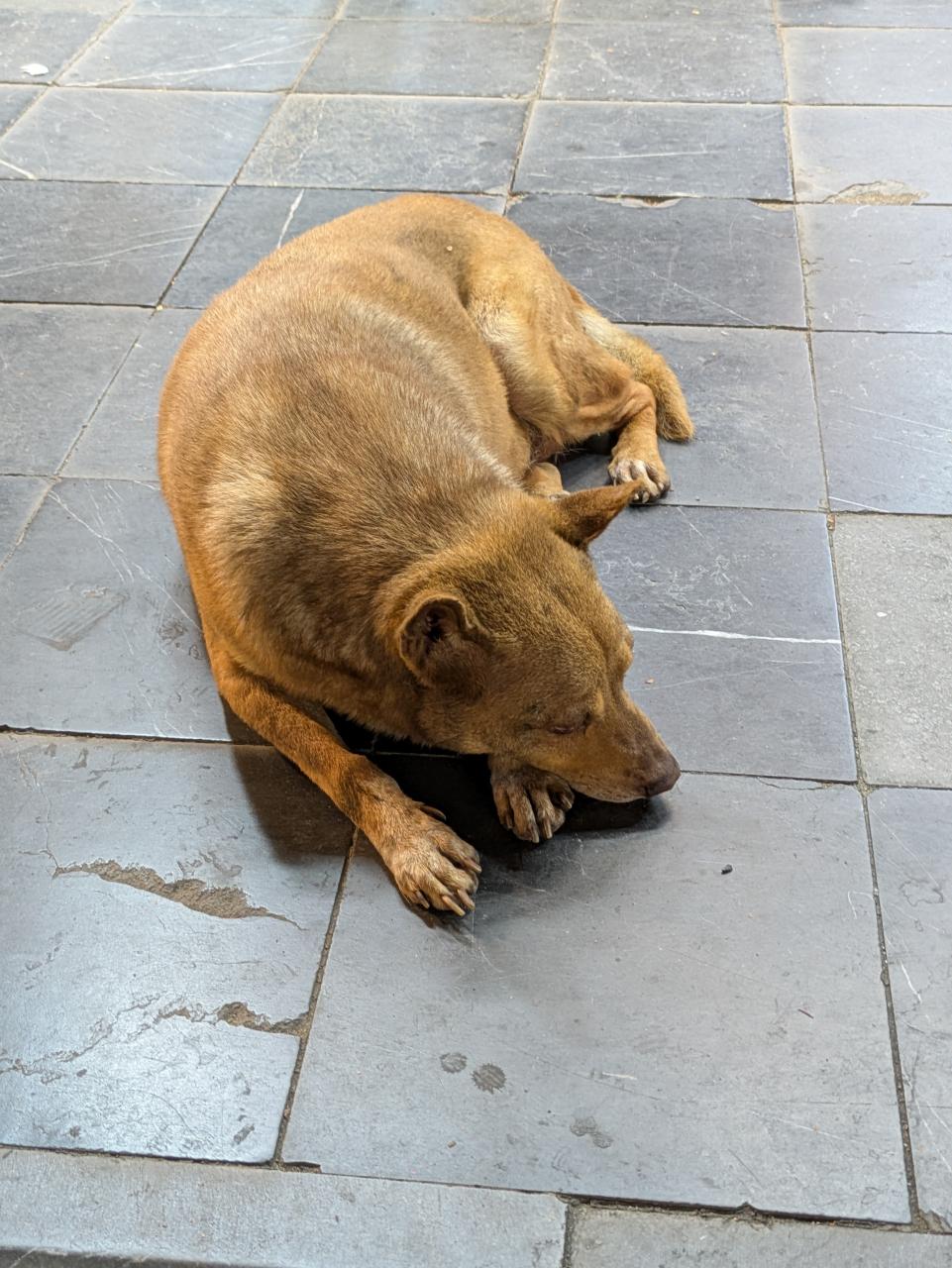 お店の入口でワンコが寝ていました。こういうのは野良犬なのか飼い犬なのか…?