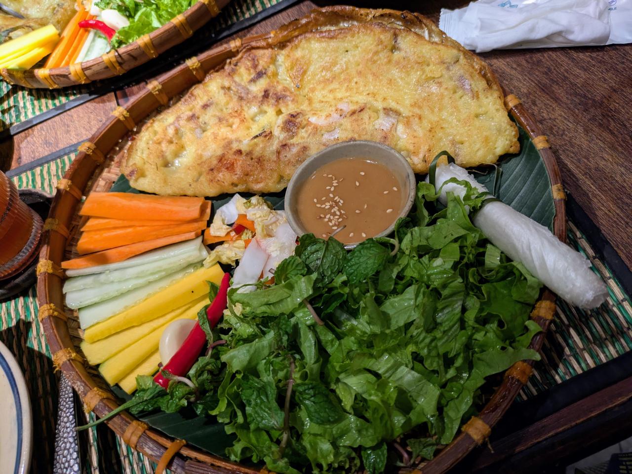 バインセオは「ベトナム風お好み焼き」や「ベトナム風クレープ」と言われ、米粉とココナッツミルク、ターメリックを使った生地を薄く焼き、中に豚肉やエビ、もやしなどの具材を包んだものです。写真上の薄黄色い半月状のものが生地で、普通はこれに具材を包んで食べますが、このお店ではライスペーパー(写真右の白い棒状のもの。長方形のライスペーパーをくるくる巻いてある)で、この生地(お店の人が細長く切ってくれる)と野菜などを巻いて食べます。形は生春巻き。ライスペーパーがパリパリしているので、生春巻きとはまた食感が違います。 -