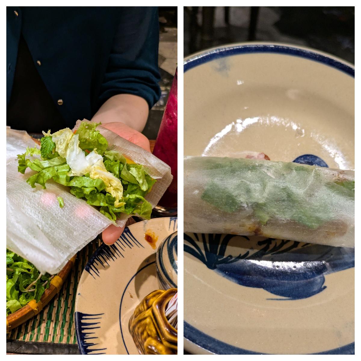 ライスペーパーで生地と具材を巻き、甘酸っぱいソースにつけて食べます。野菜たっぷりでおいしかったです。