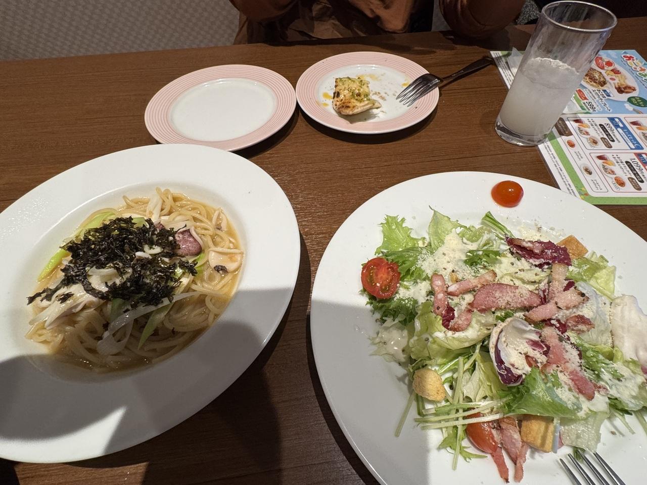 ピザが目的なので、メインは一番安いヤリイカとネギの醤油バターとシーザーサラダ(いずれも768円)にして、ドリンクバー(328円)も付けました。