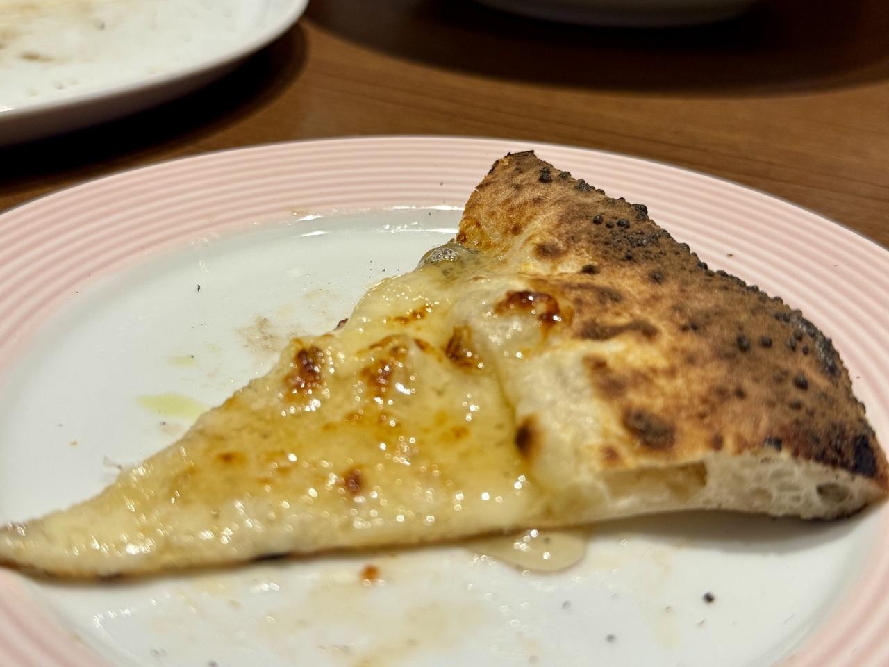 蜂蜜がテーブルに置いてあり、チーズのピザは蜂蜜をかけて食べるのが好きなので、たっぷりかけて頂きます。
