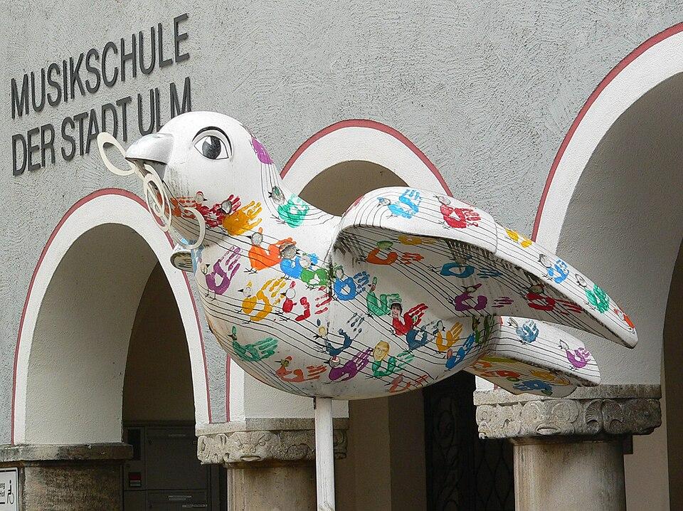 参考写真:Ulmer Spatzウルムの雀の作品の一部(カラフルな姿は、普通は小枝だが、こちらはト音記号をくわえている。音楽学校の前だからのようです!) -