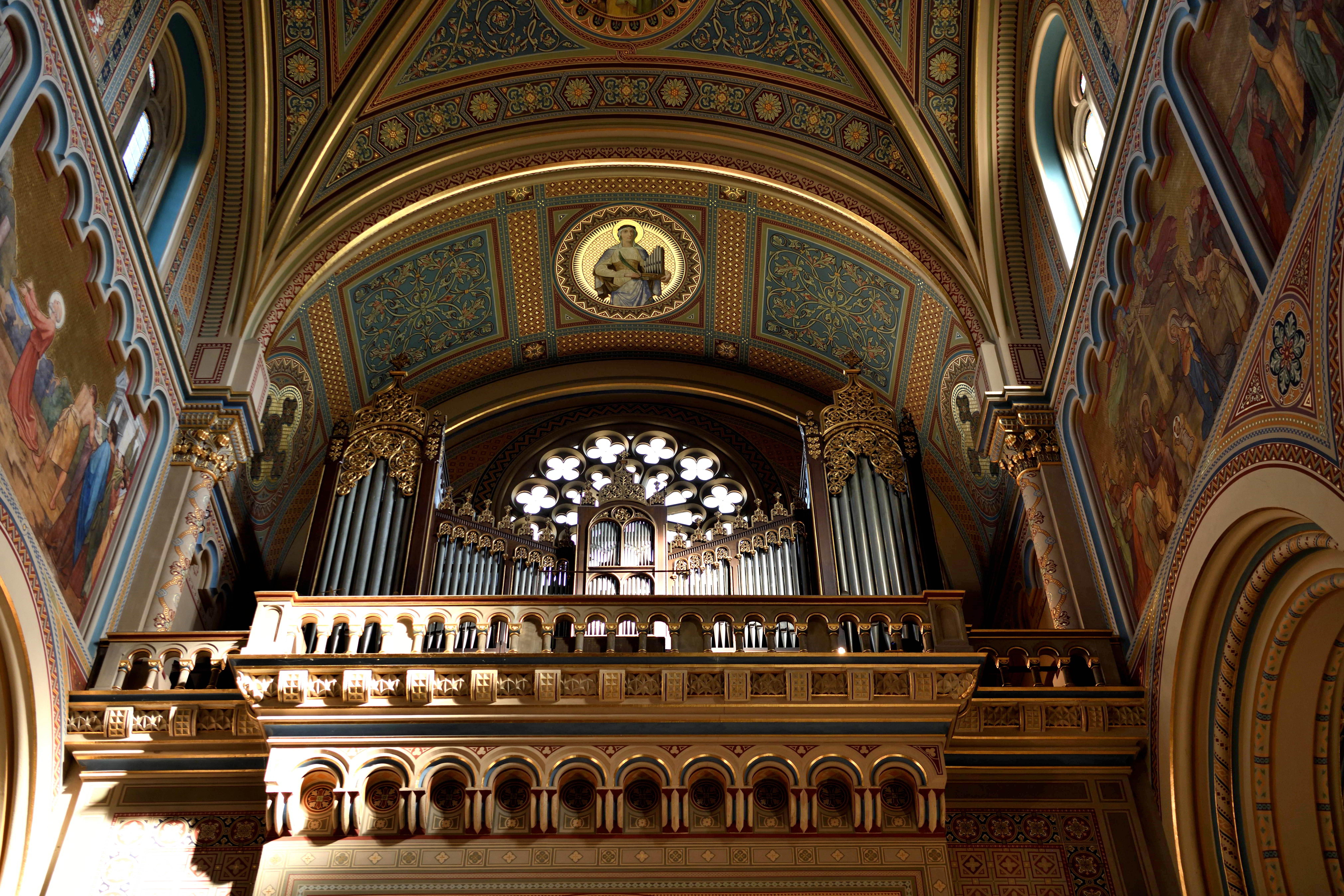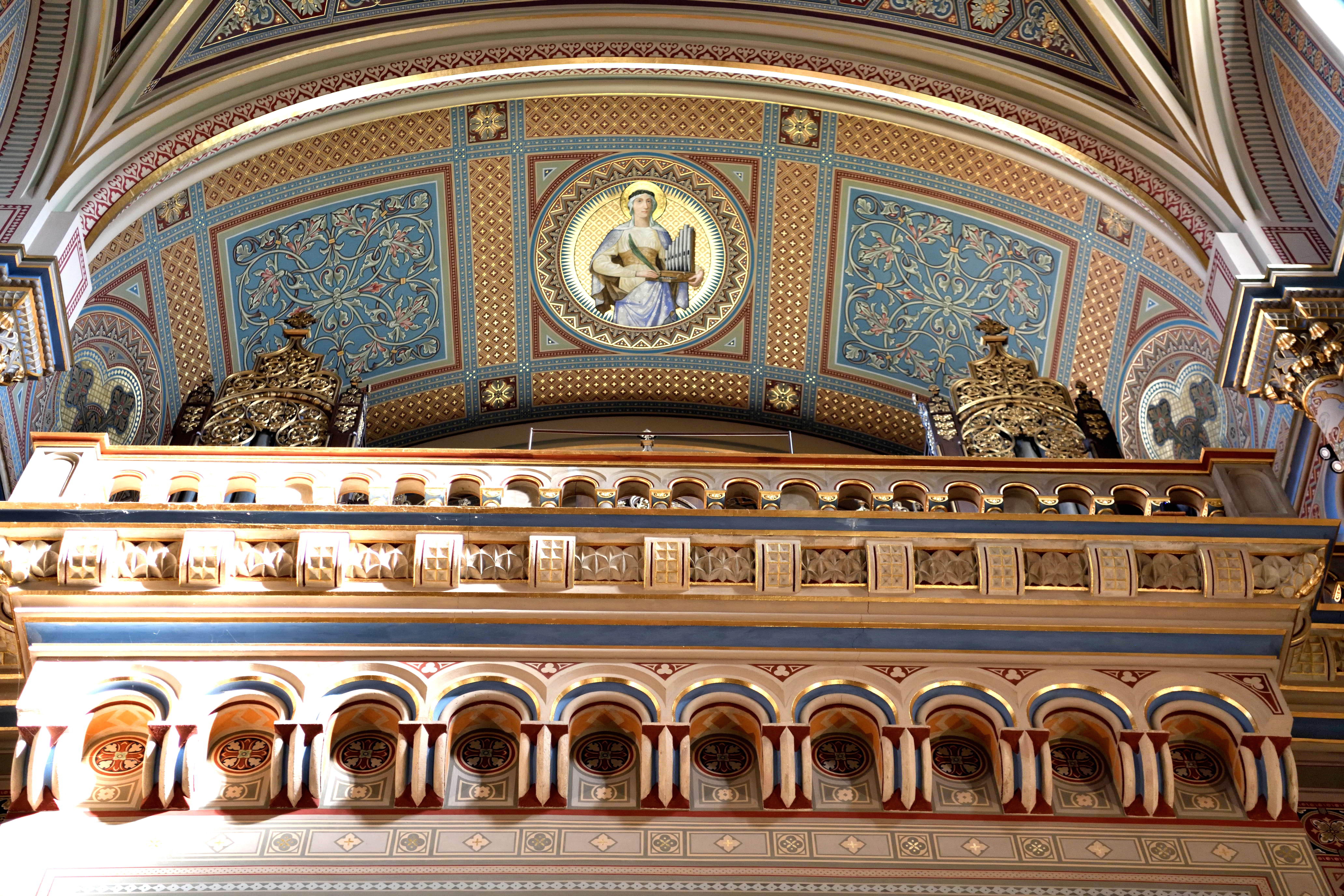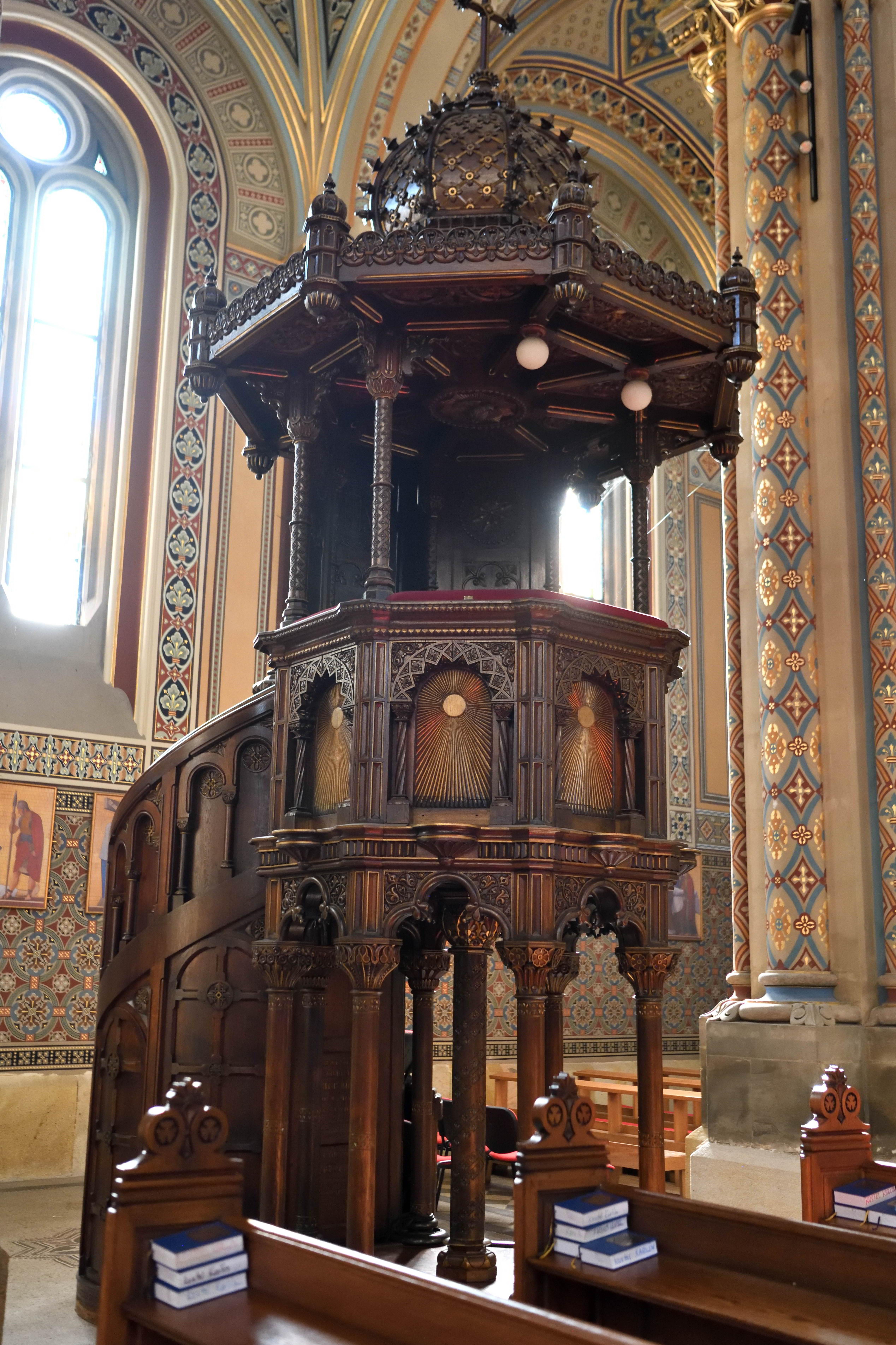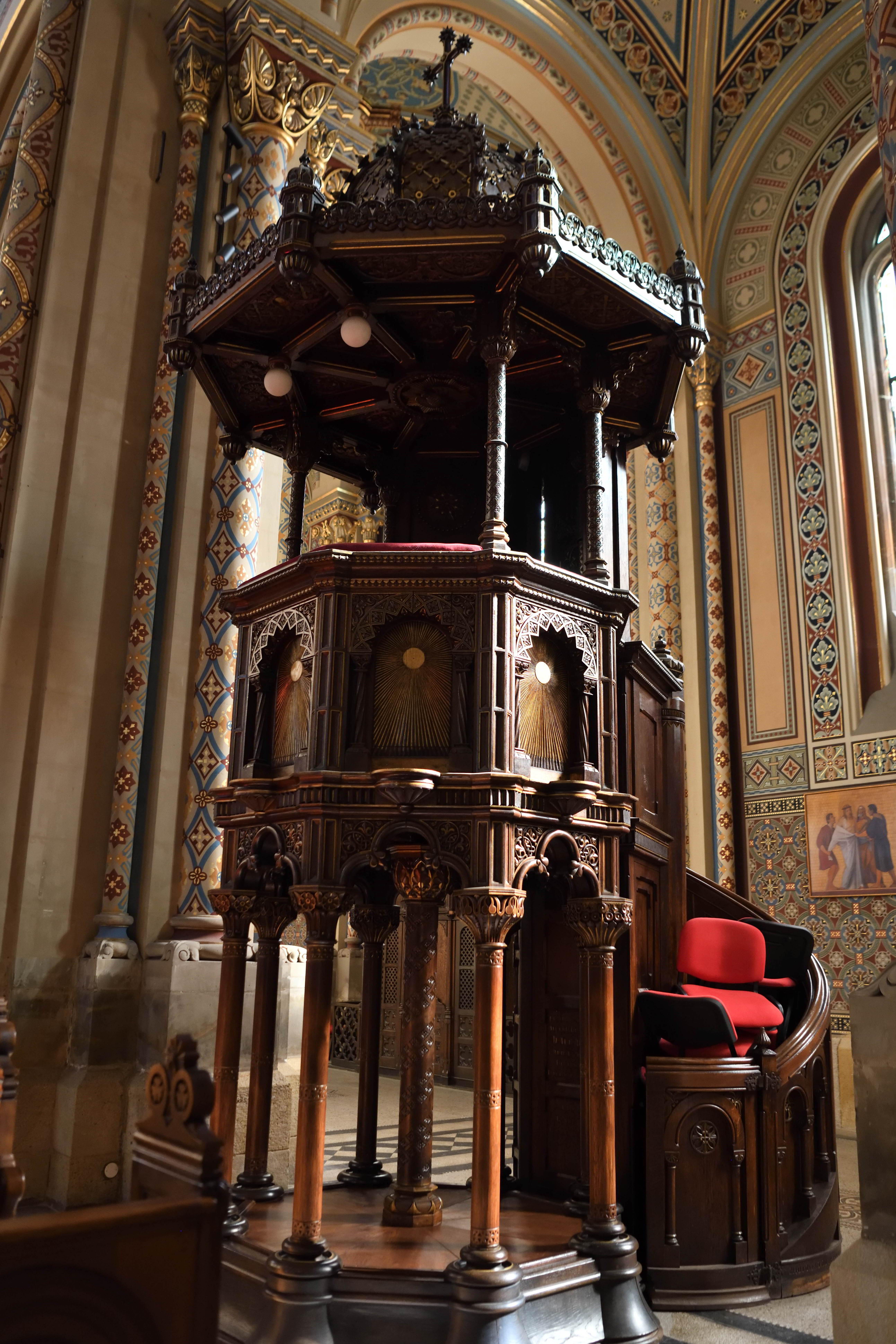 重厚な木彫りの説教壇が堂内の装飾と調和していて、細かな彫刻の力強さと温かみが同時に伝わってきました。 -