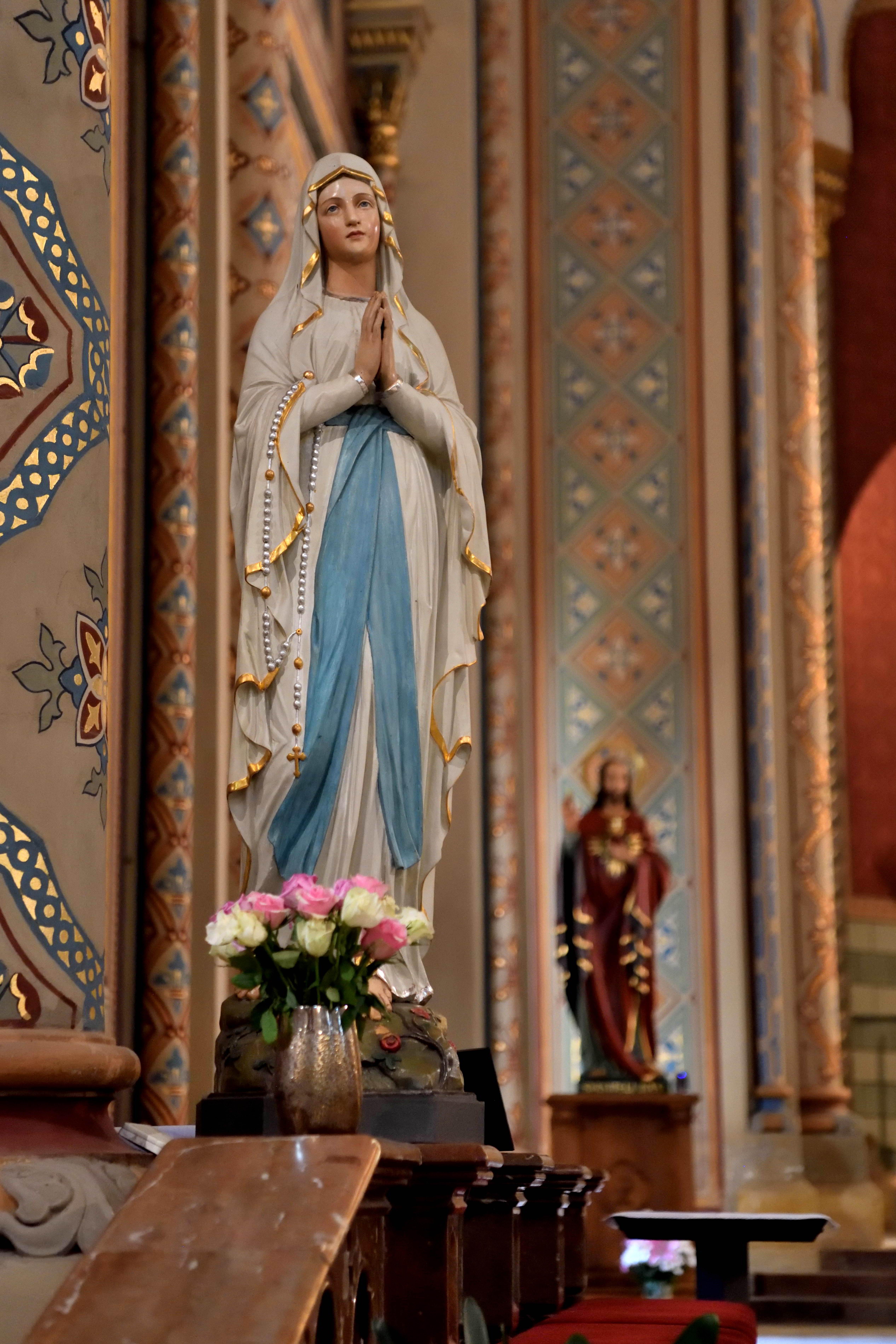 白と青の衣をまとったマリア像が優しく佇み、手前の花が祈りの空気をそっと和らげていました。