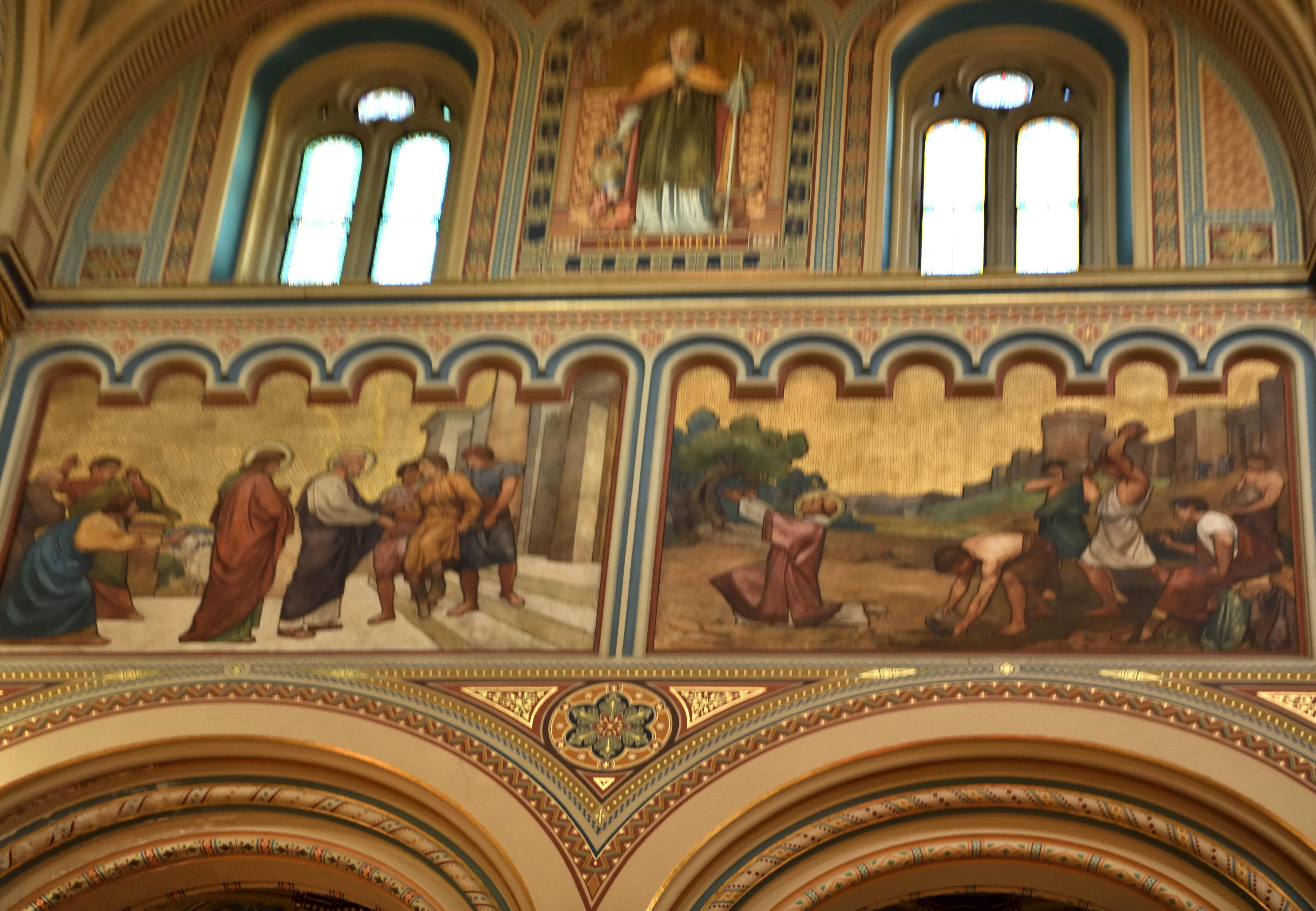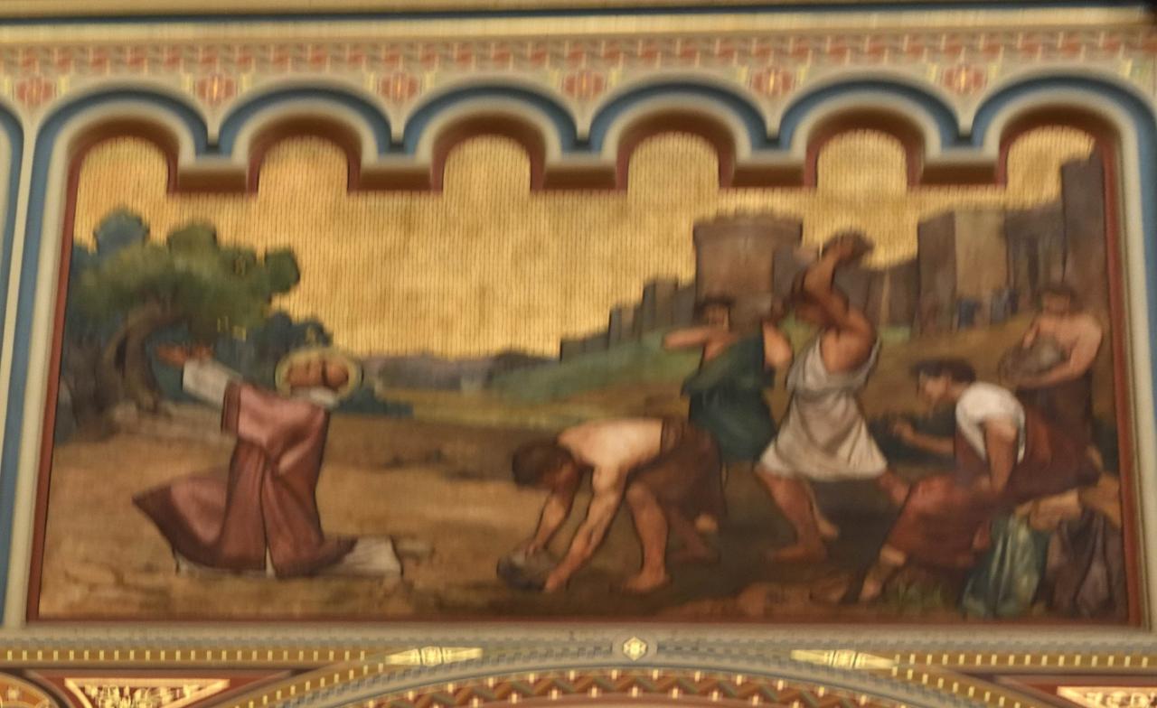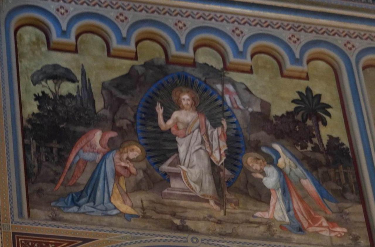 大きな壁画が堂内いっぱいに広がり、上には聖書の場面、下には当時の人々の様子が描かれていて、とても見応えがありました。