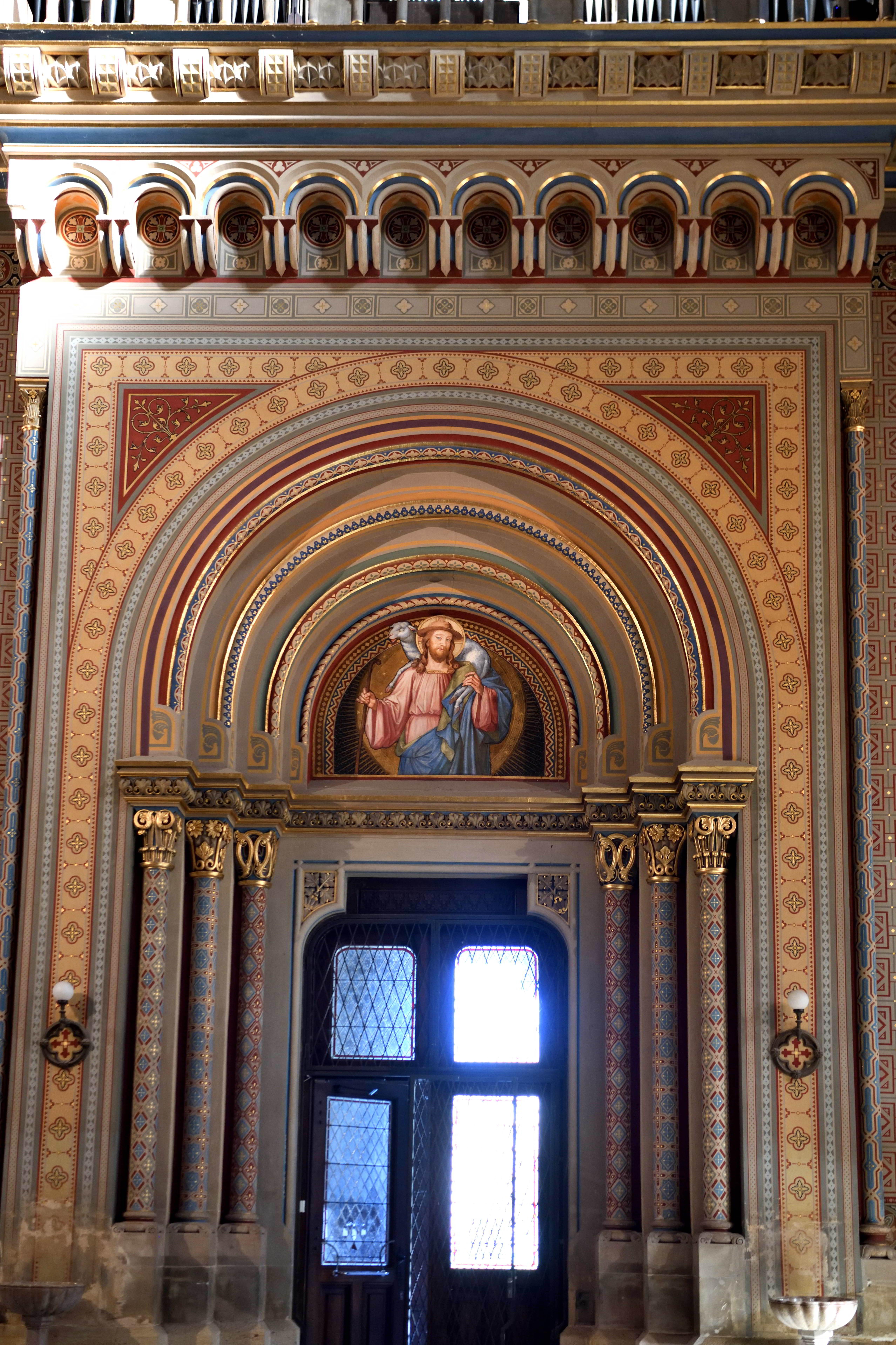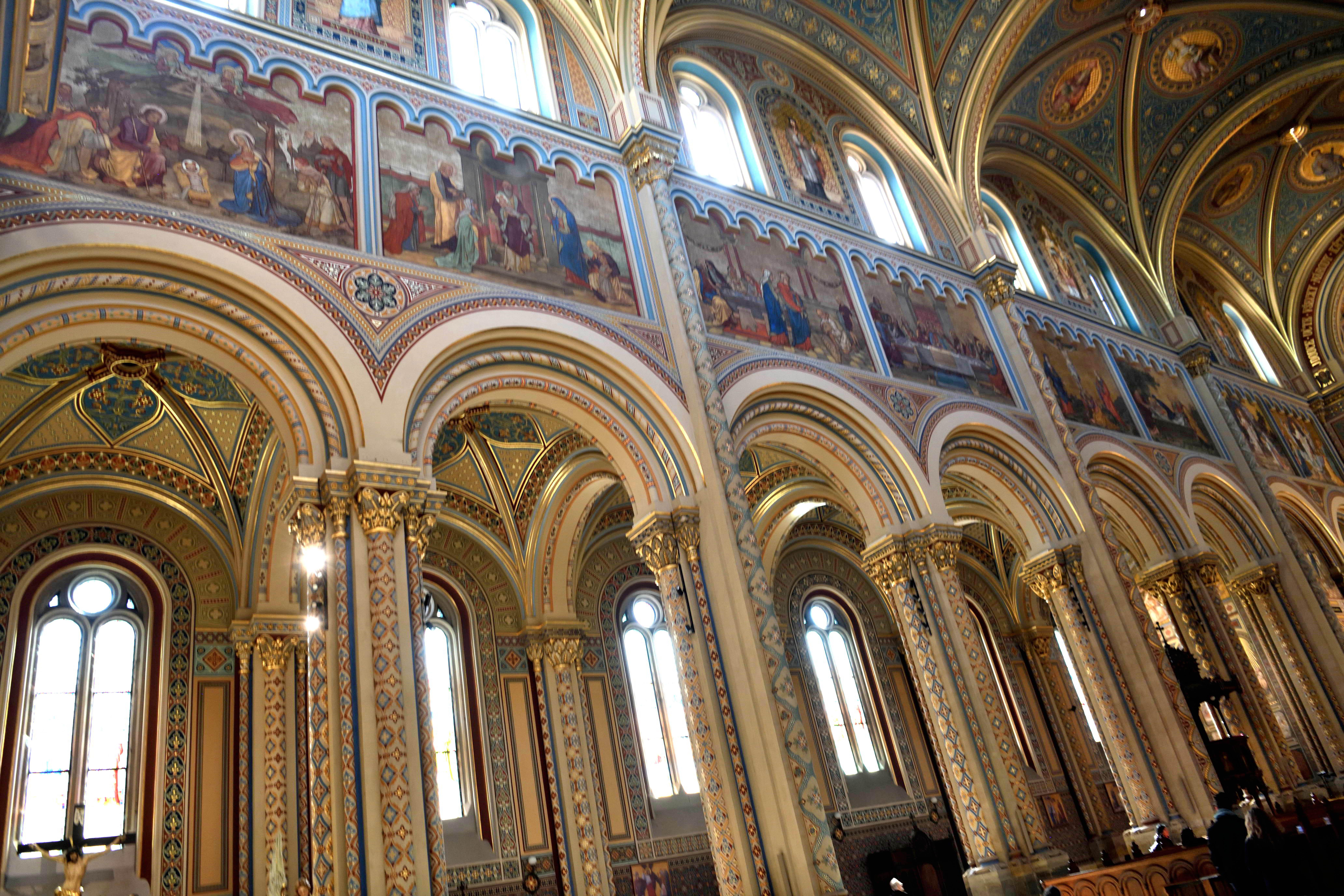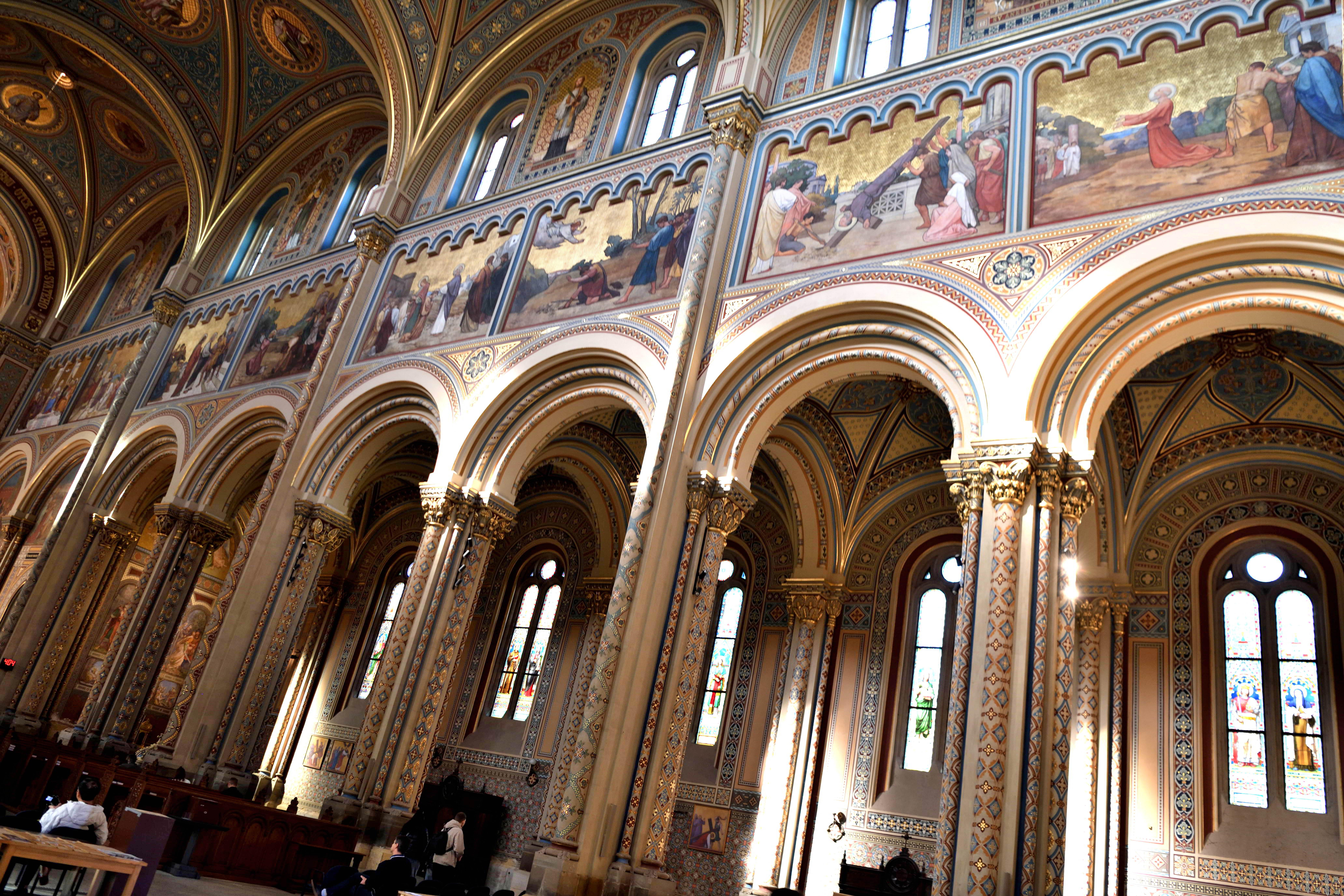 アーチの中に物語がいくつも描かれていて、教会全体の歴史や信仰が一枚の壁にぎゅっと詰まっているようでした。
