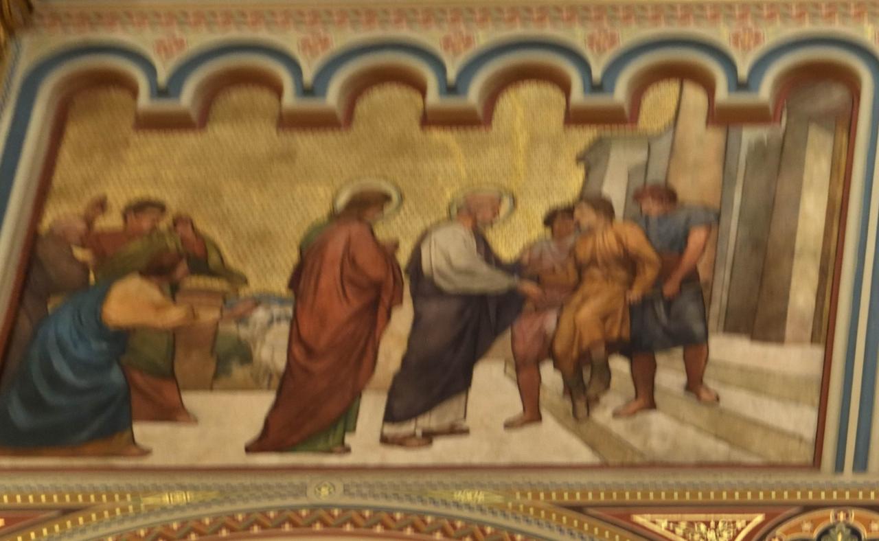 中央の聖人が座る人物に手を差し伸べ、周囲の人々が見守る姿が丁寧に描かれていました。