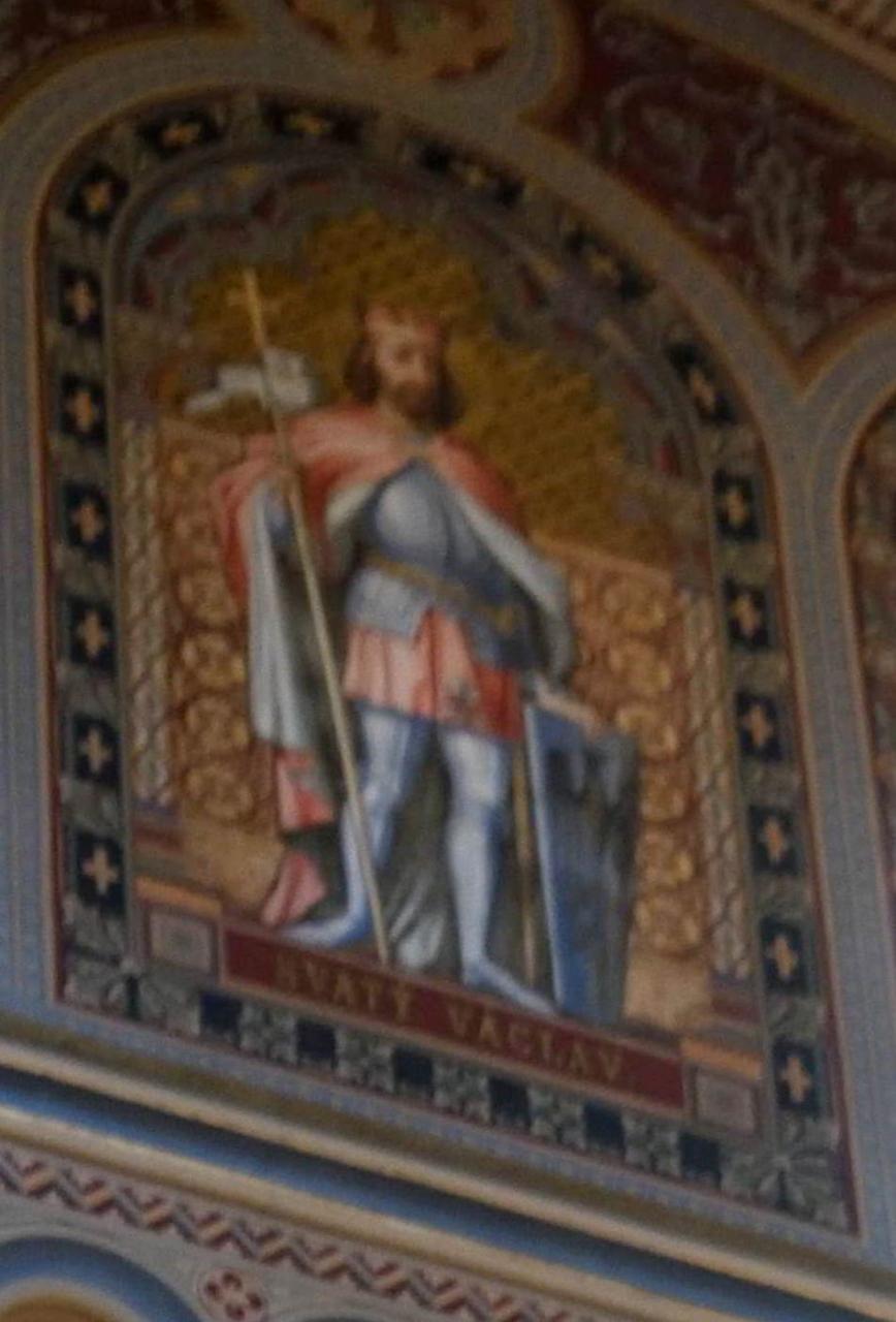 赤いマントをまとった聖ヴァーツラフが力強く立ち、金色の背景がその存在感をさらに引き立てていました。