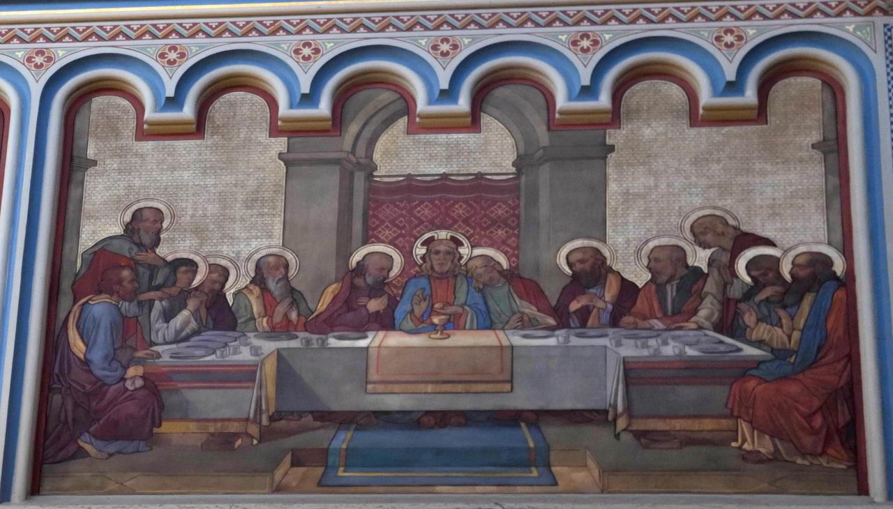 イエスと十二人の弟子たちがテーブルを囲む、有名な「最後の晩餐」の様子が描かれていました。