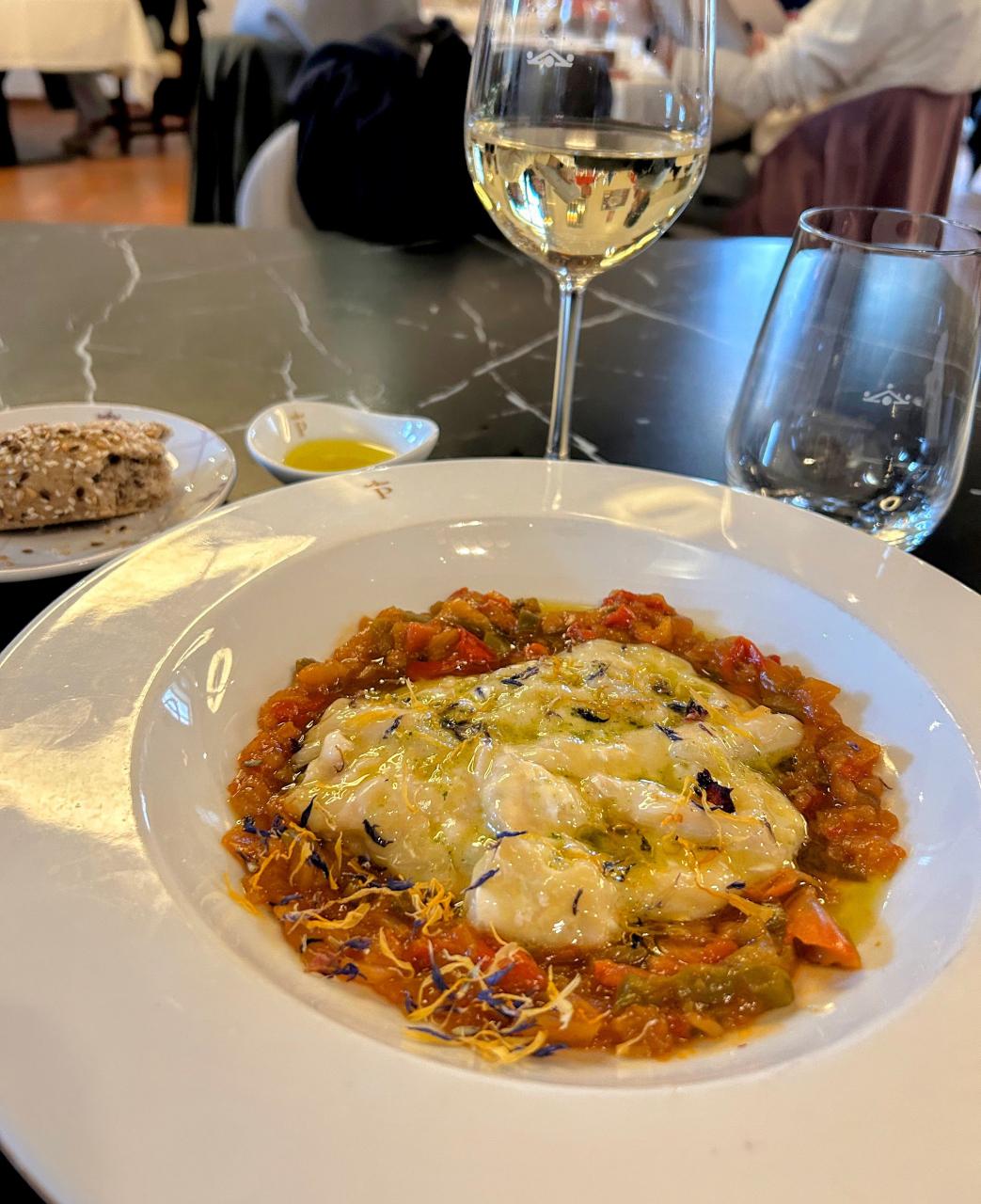 カポナータもしくはラタトゥイユ風の野菜が下にあり、非常に美味しかったです。 -