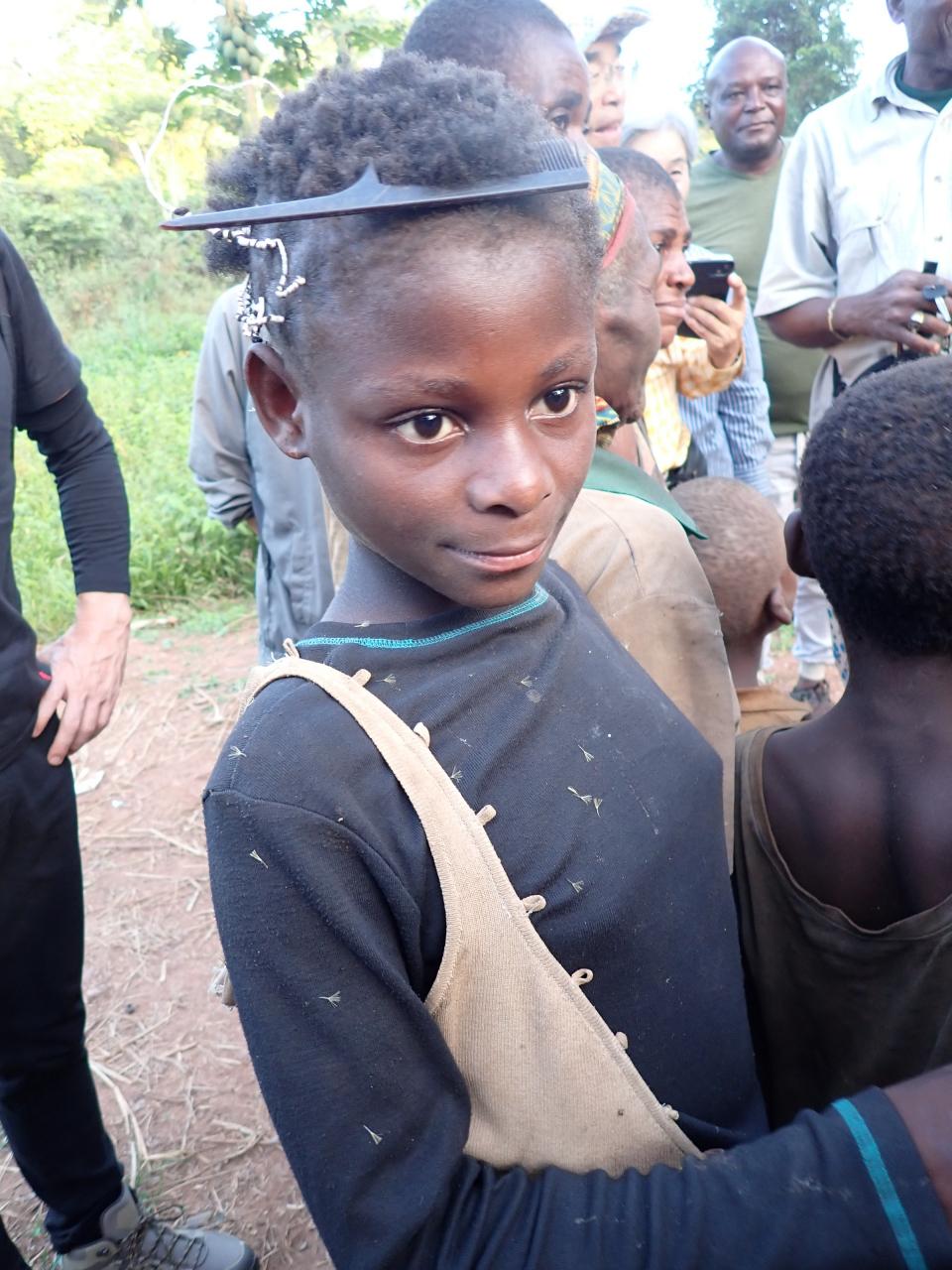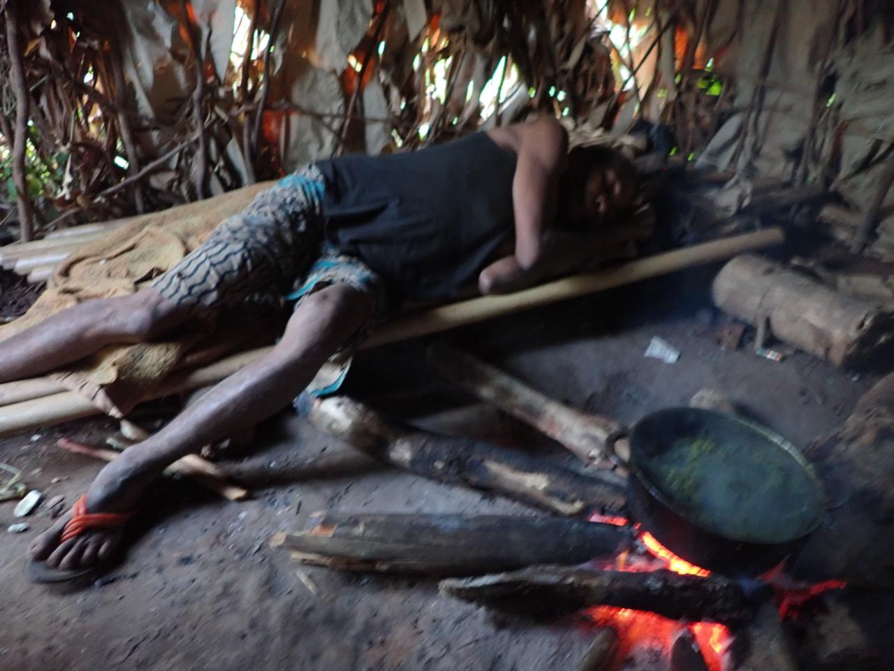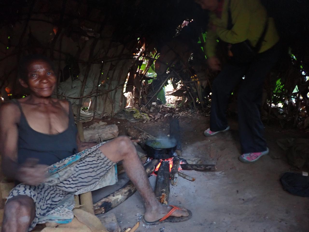 途中、道端で暮らす定住化したバカの家族のお宅訪問。農耕民バントゥーと生活を共にし、森を出て、農耕の暮らしにシフトした人々です。バカとバントゥーは、元々共生関係にあり、バカが森から採ってくるフルーツや蜂蜜、野生肉(ブッシュミート)と、バントゥーが栽培する作物(バナナやキャッサバ)を交換しながら暮らしを共にしていました。農耕にシフトしたバカの人々は、普段は農耕民として暮らしながら、雨季には数ヶ月の間森に入り、蜂蜜や果物を採取するという暮らしをしています。