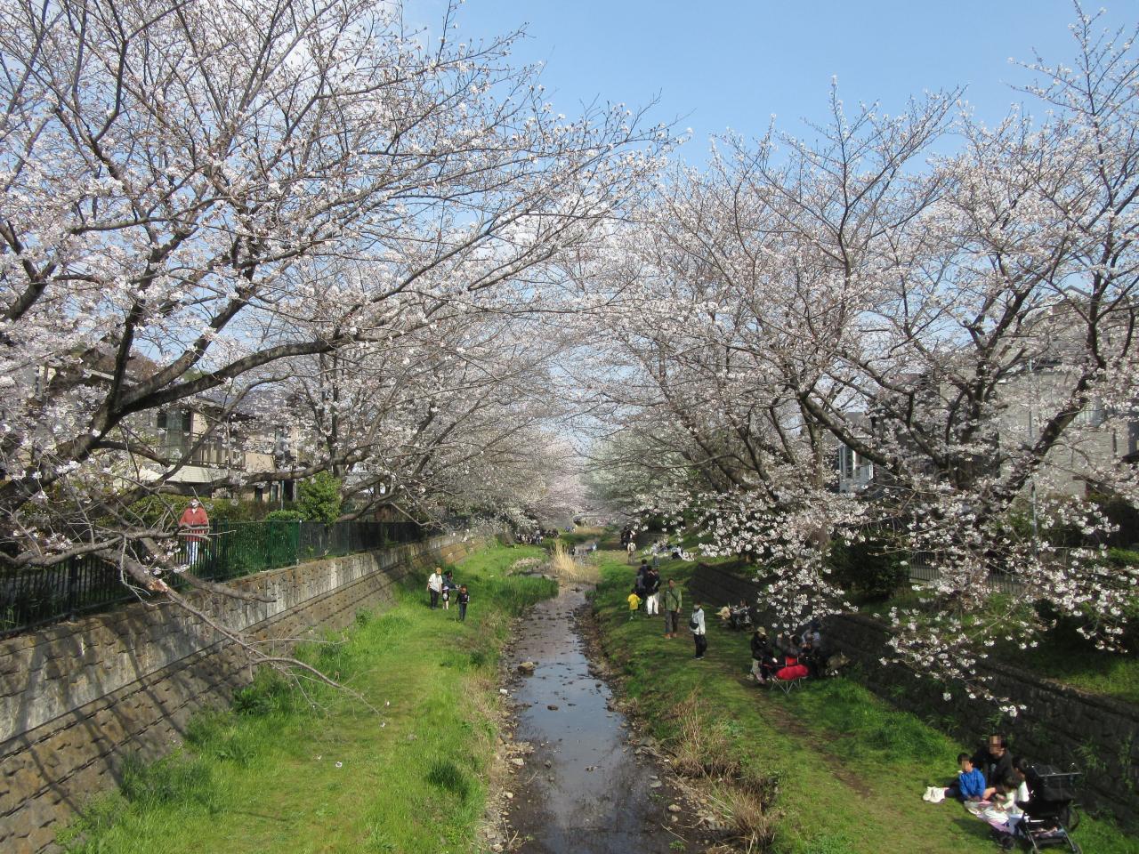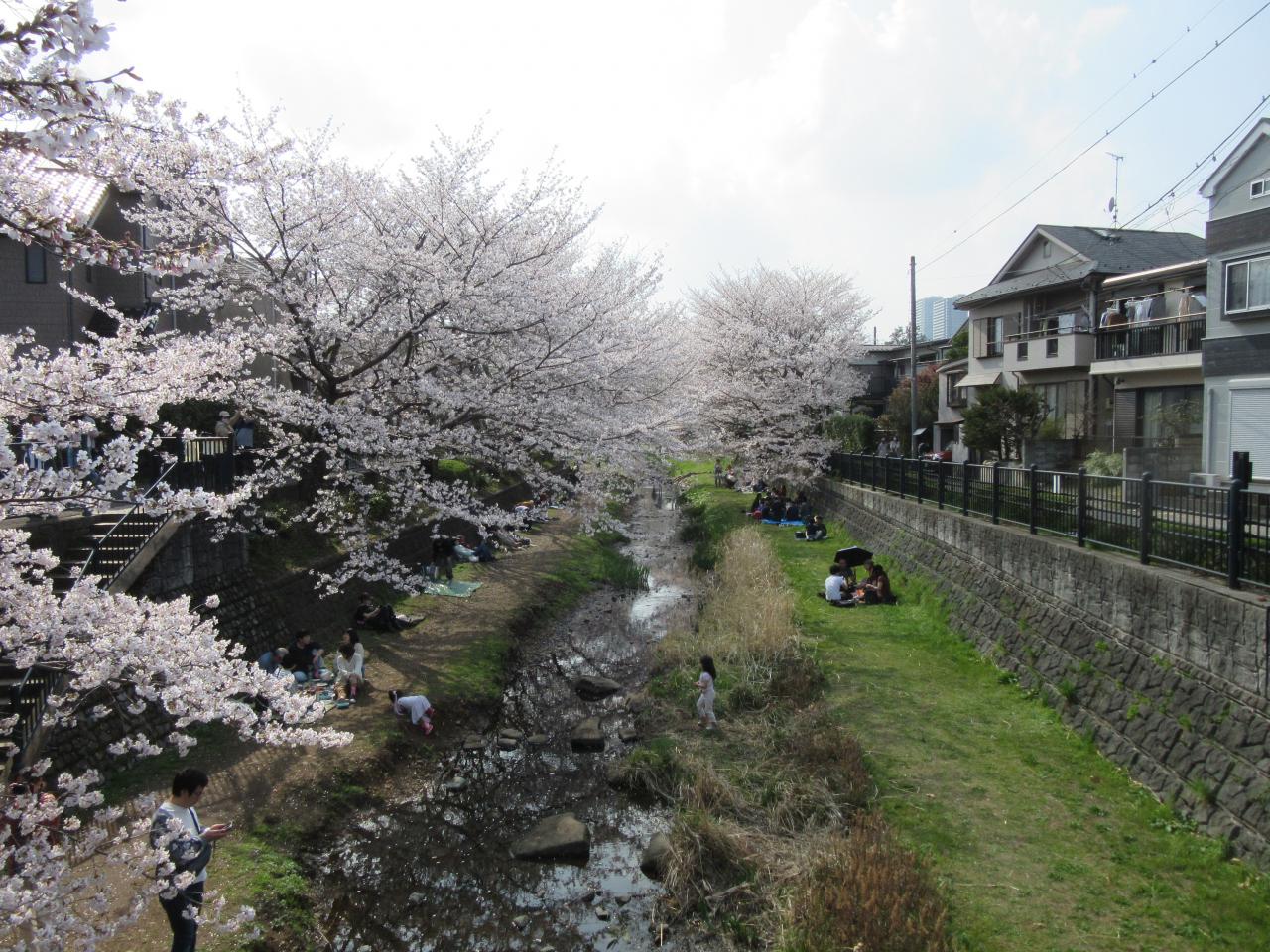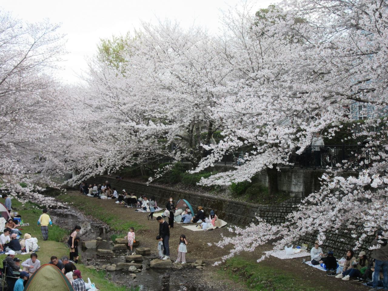 この時期はお花見ピクニックを楽しむために多くの家族連れで賑わいます野川西之橋 名所・史跡