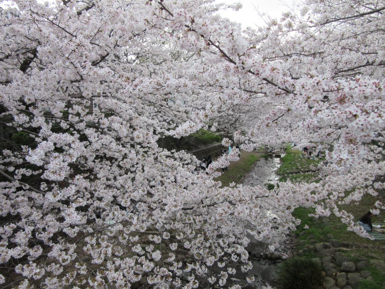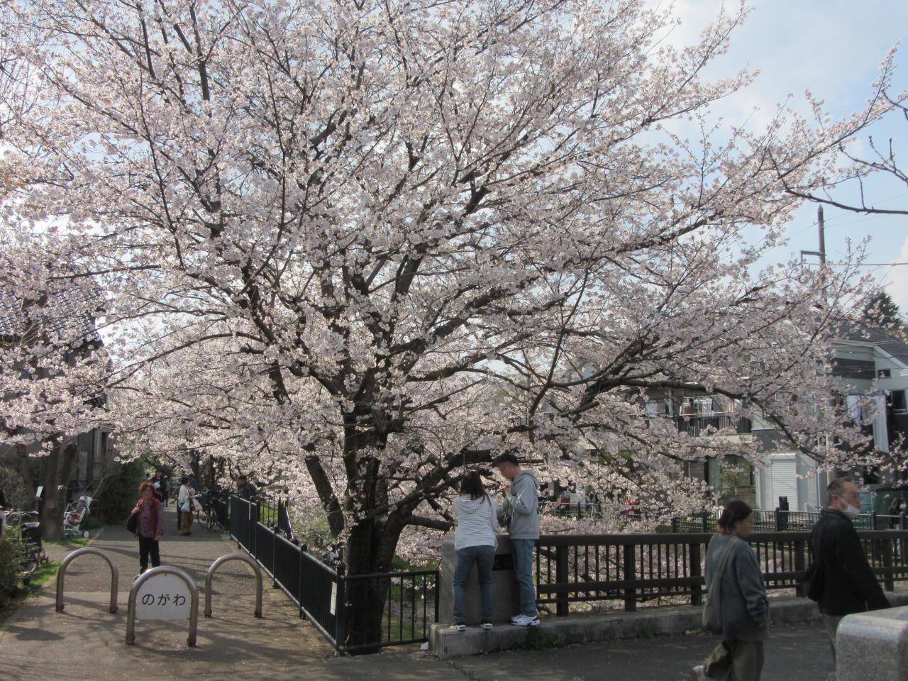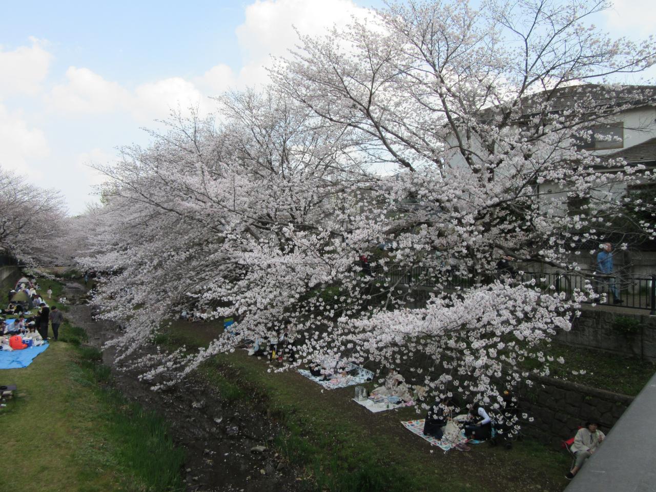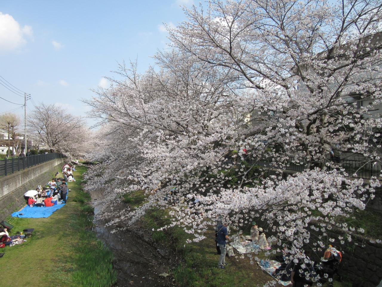 この時期はお花見ピクニックを楽しむために多くの家族連れで賑わいます野川西之橋 名所・史跡