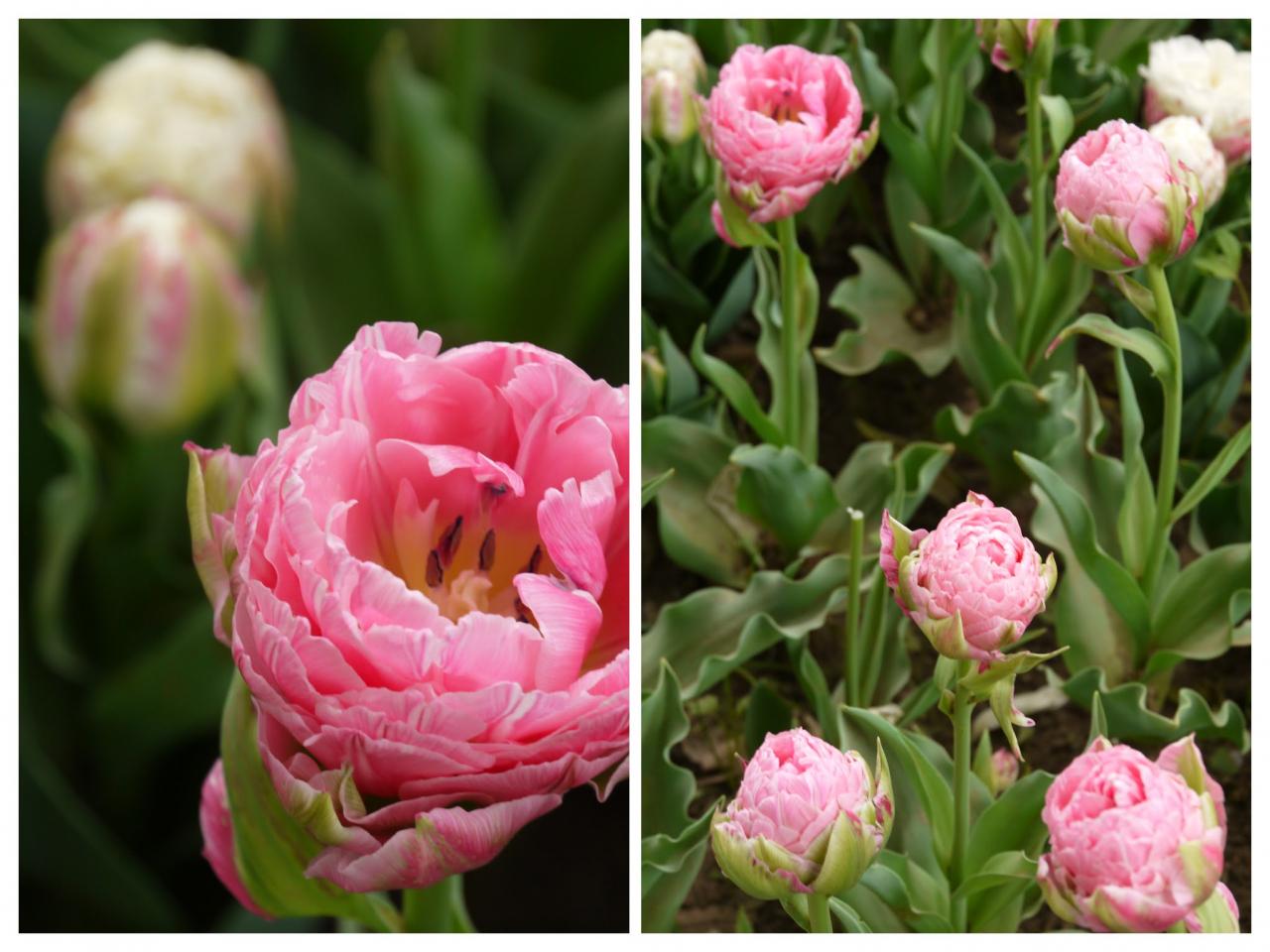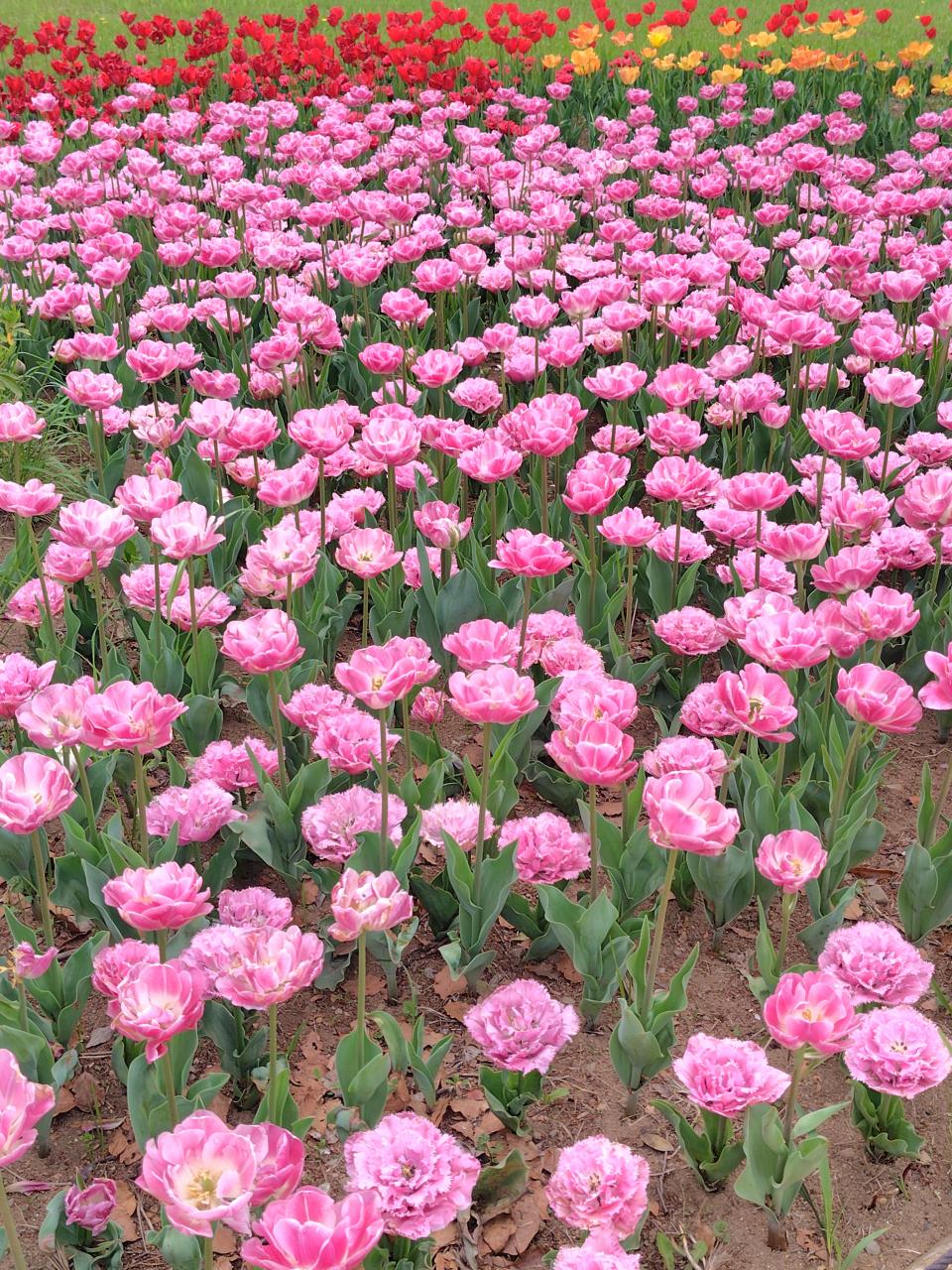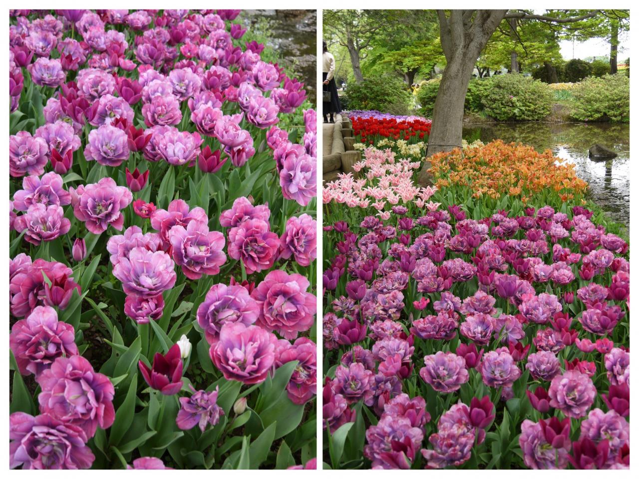 チューリップガーデンの風景は実に壮観で、一重のものもあれば八重のゴージャスなものもあり、花びらがエレガントに反り返ったものもあって、どれも本当に可愛いですね!私もほぼ同じ風景を見ているので、「そうそう、こうだった!」と嬉しく思い出しました。。