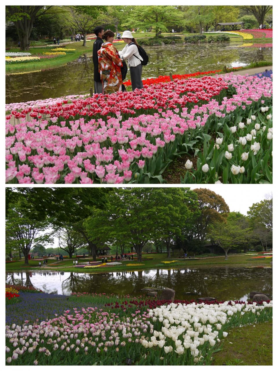 ウエディングの前撮りのカップル、私も見かけましたが、和服姿の方もいたんですね~ 見事なチューリップの中で、きっと素敵な写真が撮れたのでしょうね。