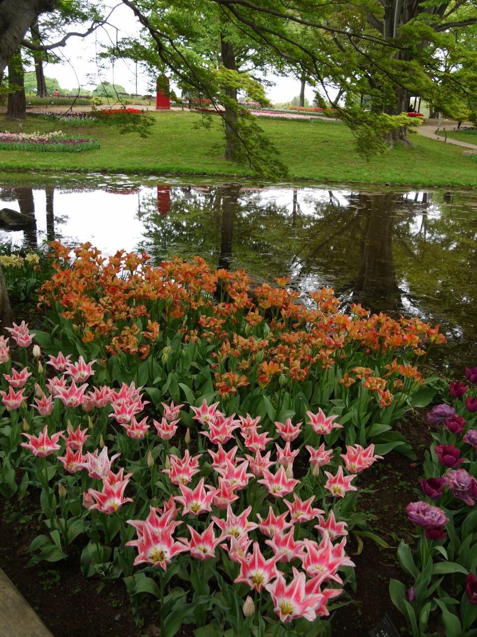 変わった色合いの紫のチューリップ。水辺伝いに歩く。