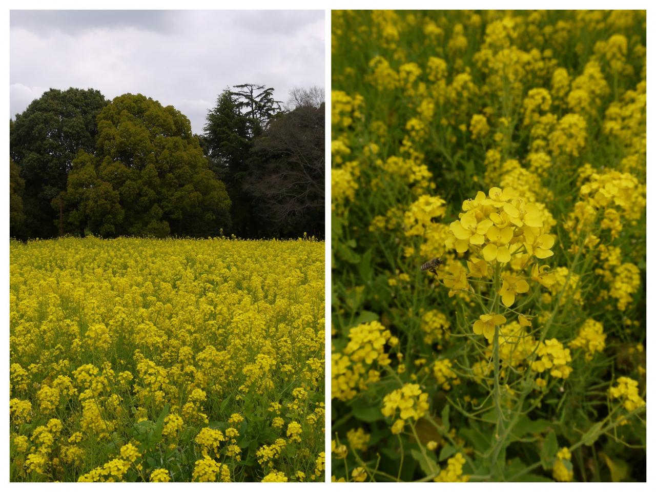 広場の向こうには菜の花も。