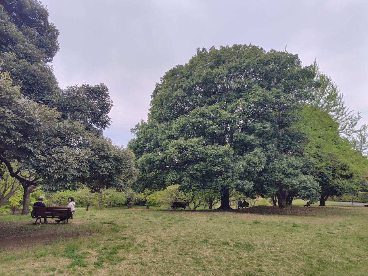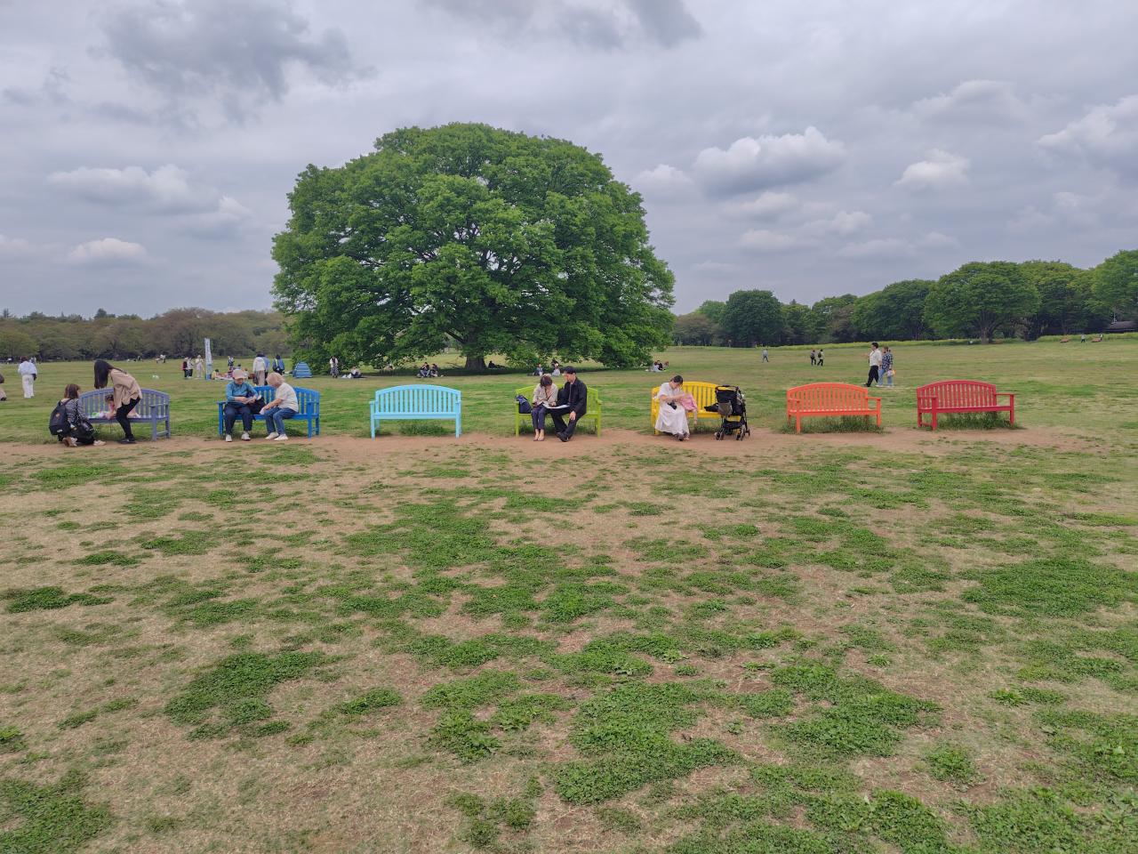 大ケヤキと虹色のベンチ。思い思いに坐ってお昼弁当を拡げてる。