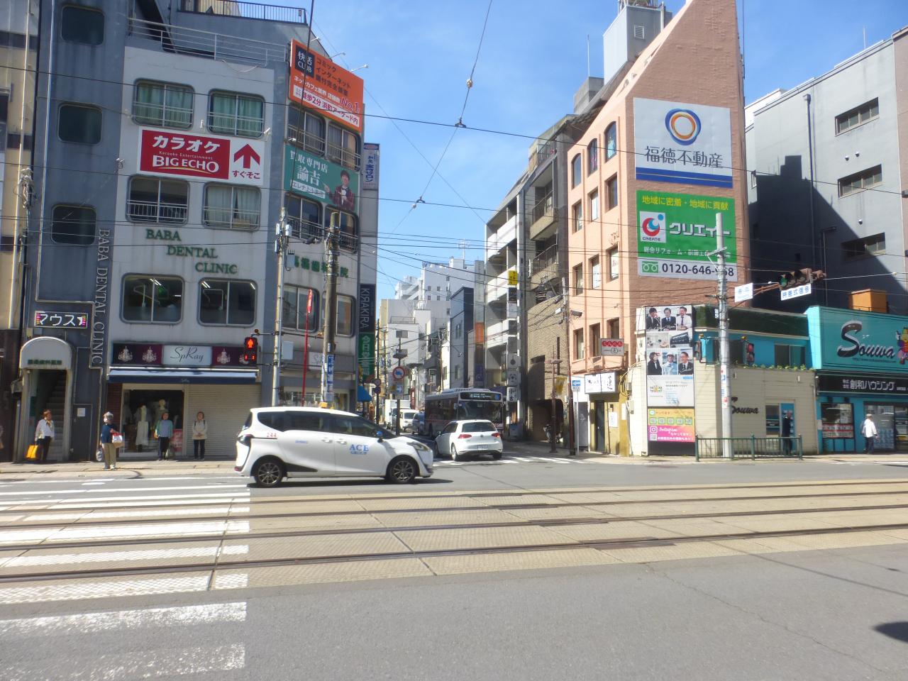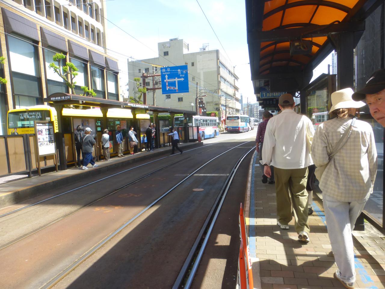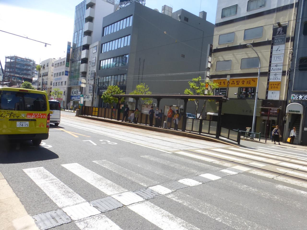 路面電車の観光通り電停(石橋方面行き)が見えています。