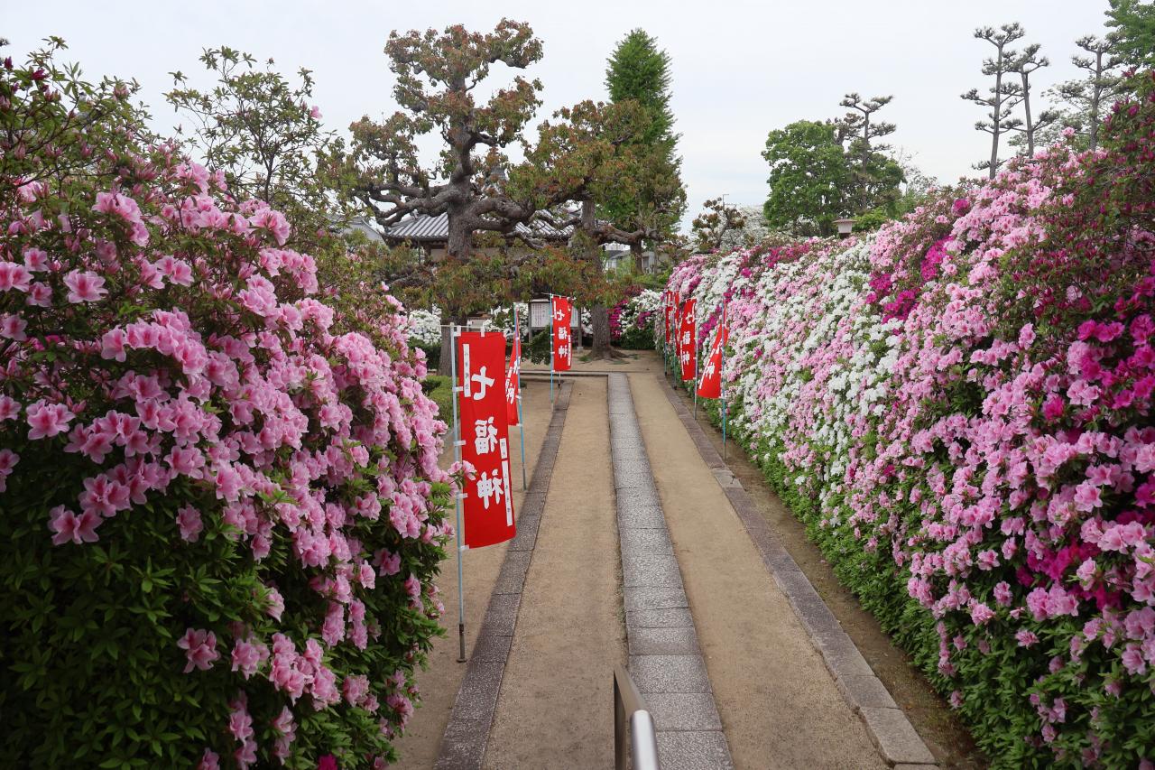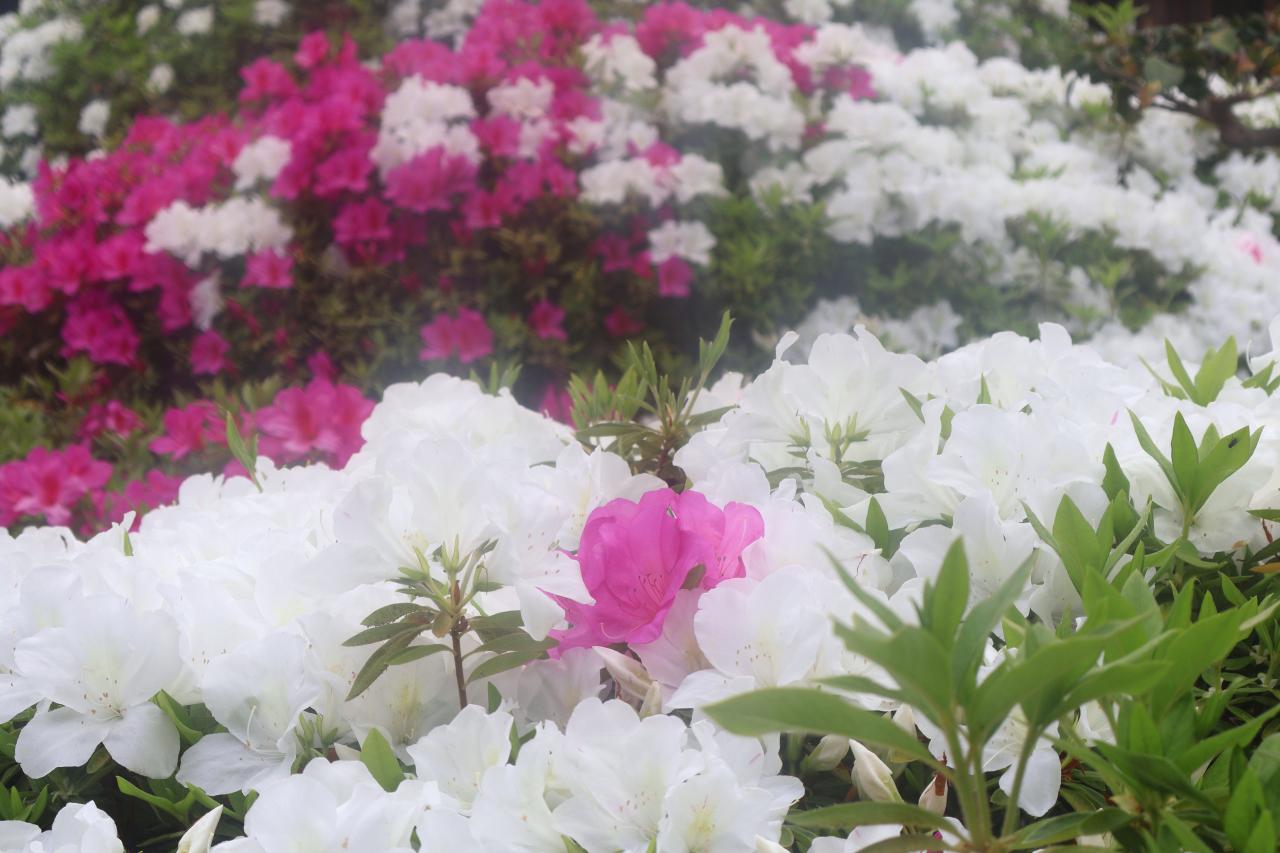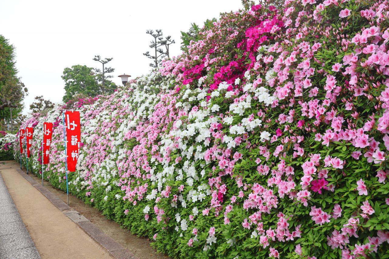 見頃となっている赤・白・ピンク約1,000株のツツジが境内を埋め尽くしていました。