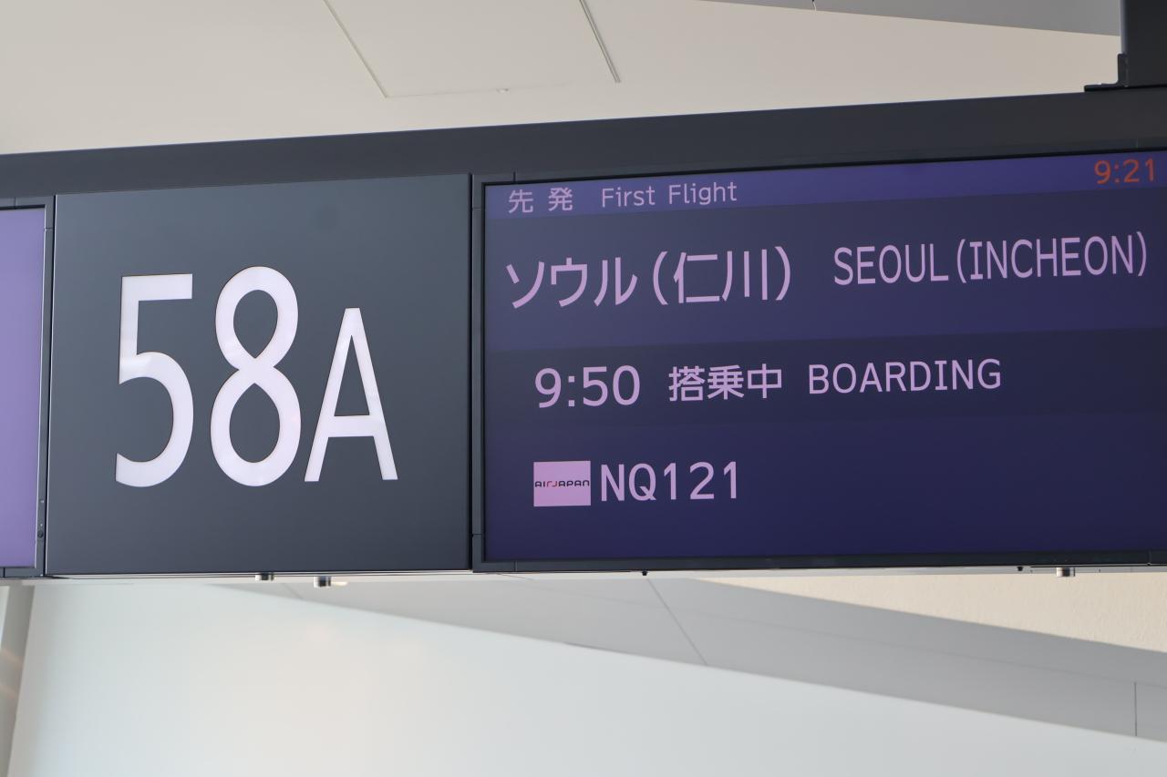成田空港第一ターミナル58A搭乗口からエアージャパンNQ121便を利用して韓国・ソウル仁川国際空港へ向かいました
